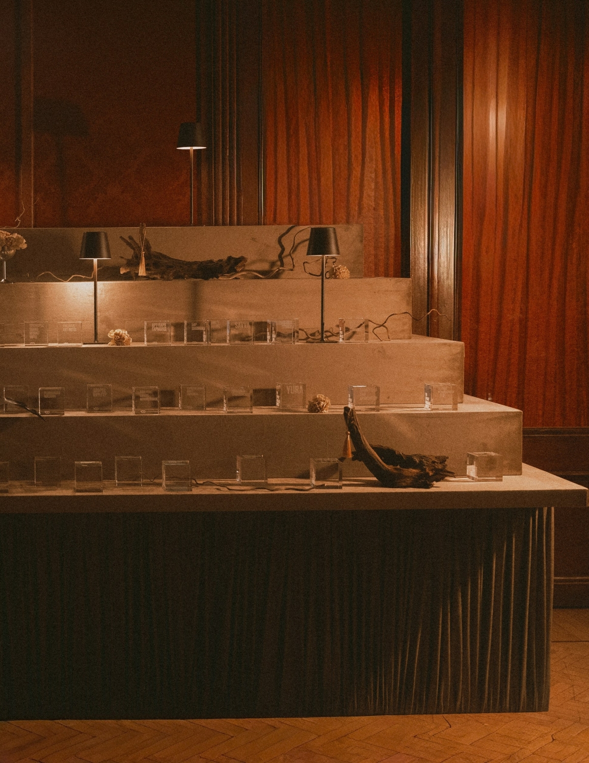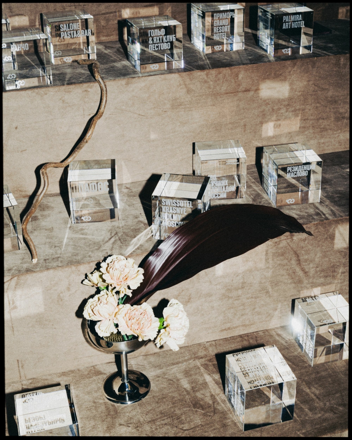Одним из самых запоминающихся решений вечера стала работа с пространством. Фонтан «Метрополя» — важная архитектурная доминанта зала, и команда отнеслась к нему бережно: не стала зашивать или маскировать, а напротив, сделала его центром вечера. Вокруг него выстроилась круговая рассадка — почти как в амфитеатре. Идея принадлежала команде декора Анастасии Юсуповой и изменила саму логику восприятия церемонии: внимание больше не было направлено в одну точку — оно циркулировало внутри пространства.