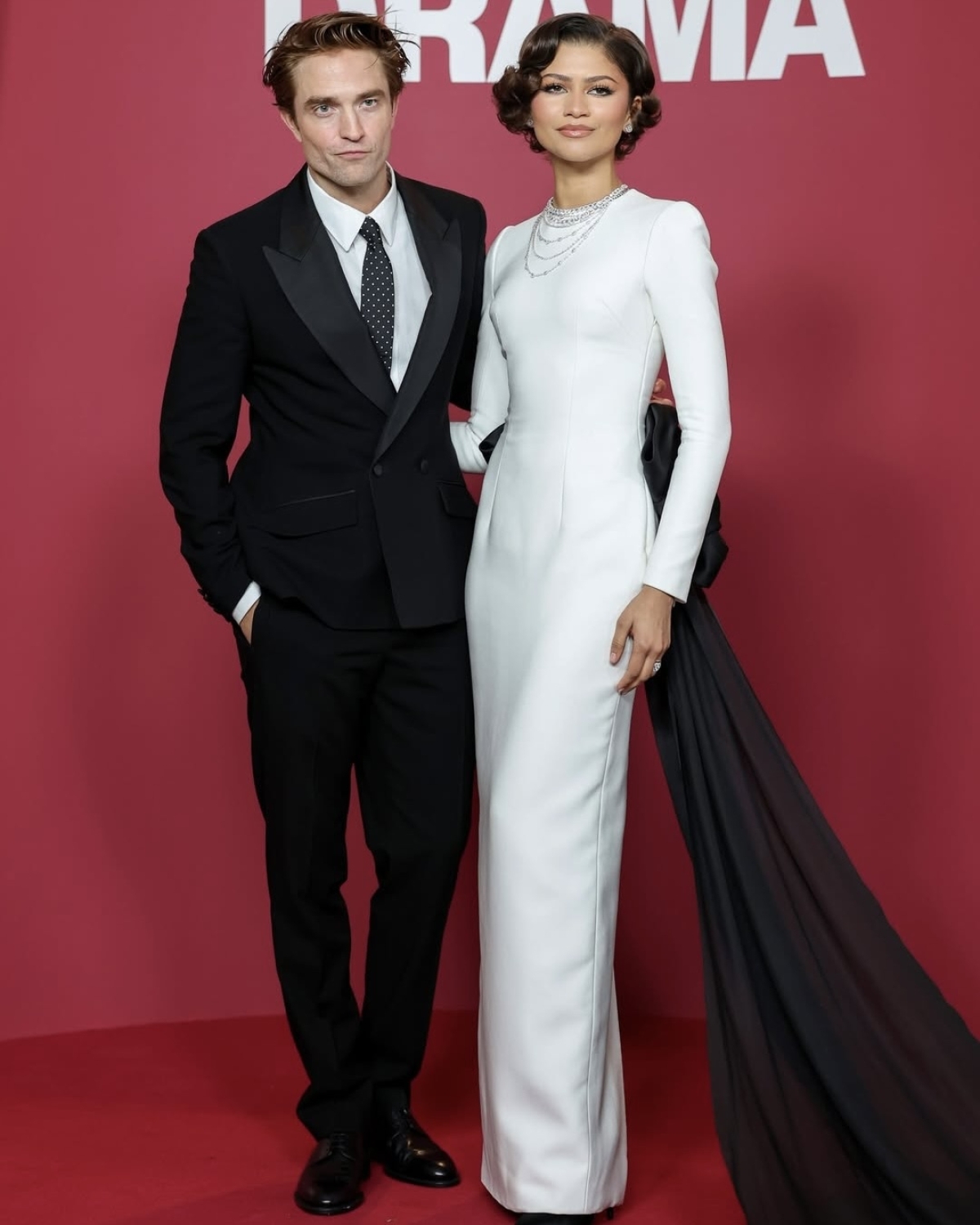 На премьере фильма «Вот это драма!» в Париже Зендея вновь предстала в свадебном. На этот раз выбор пал на кастомное платье Louis Vuitton от Николя Жескьера в лучших традициях вечернего дресс-кода: строгий силуэт, длинный рукав, открытая спина и контрастный бант, перекликающийся с черным костюмом Роберта Паттинсона. Все это — с деликатным многослойным колье и классическими лодочками.