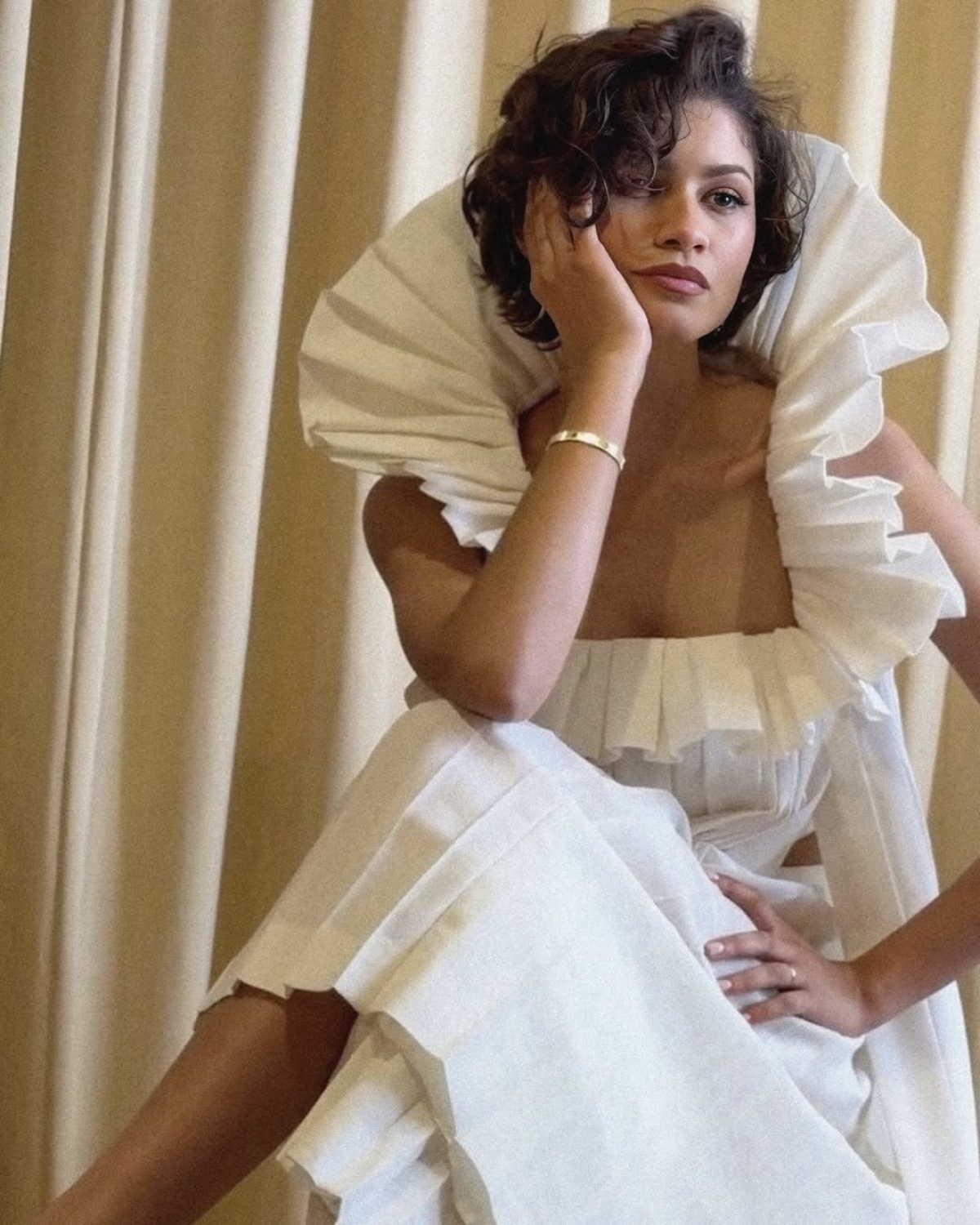 Съемку накануне премии «Оскар» Зендея провела в скульптурном платье Louis Vuitton из гофрированной ткани и с объемным воротником. Расслабленным, но по-прежнему эффектным образ делают длина по щиколотку и свободный силуэт. И, кажется, это платье могло бы быть идеальным вариантом для предсвадебного ужина.