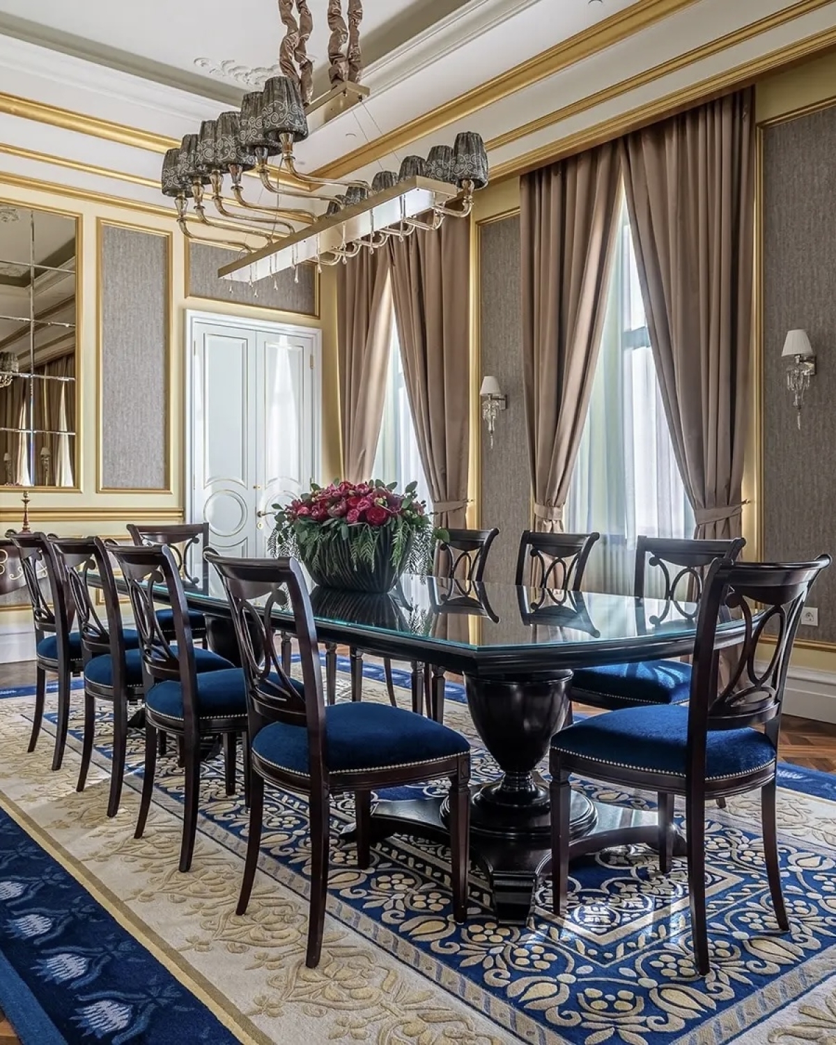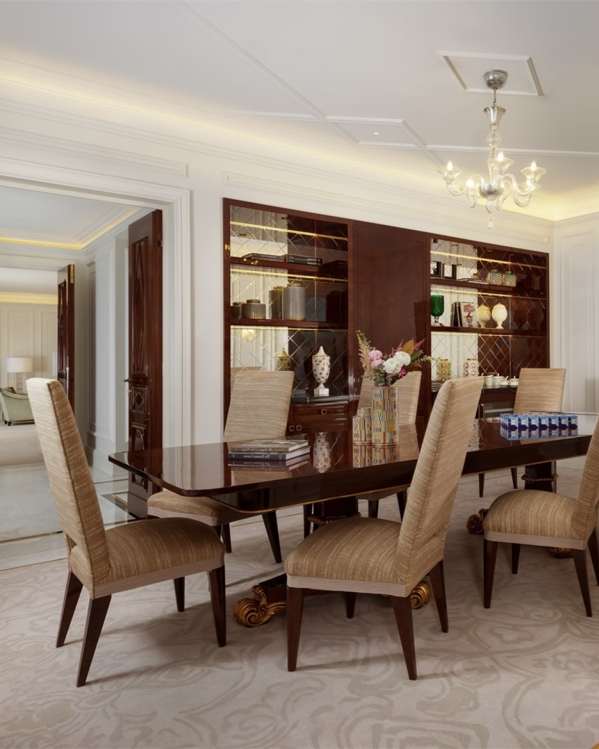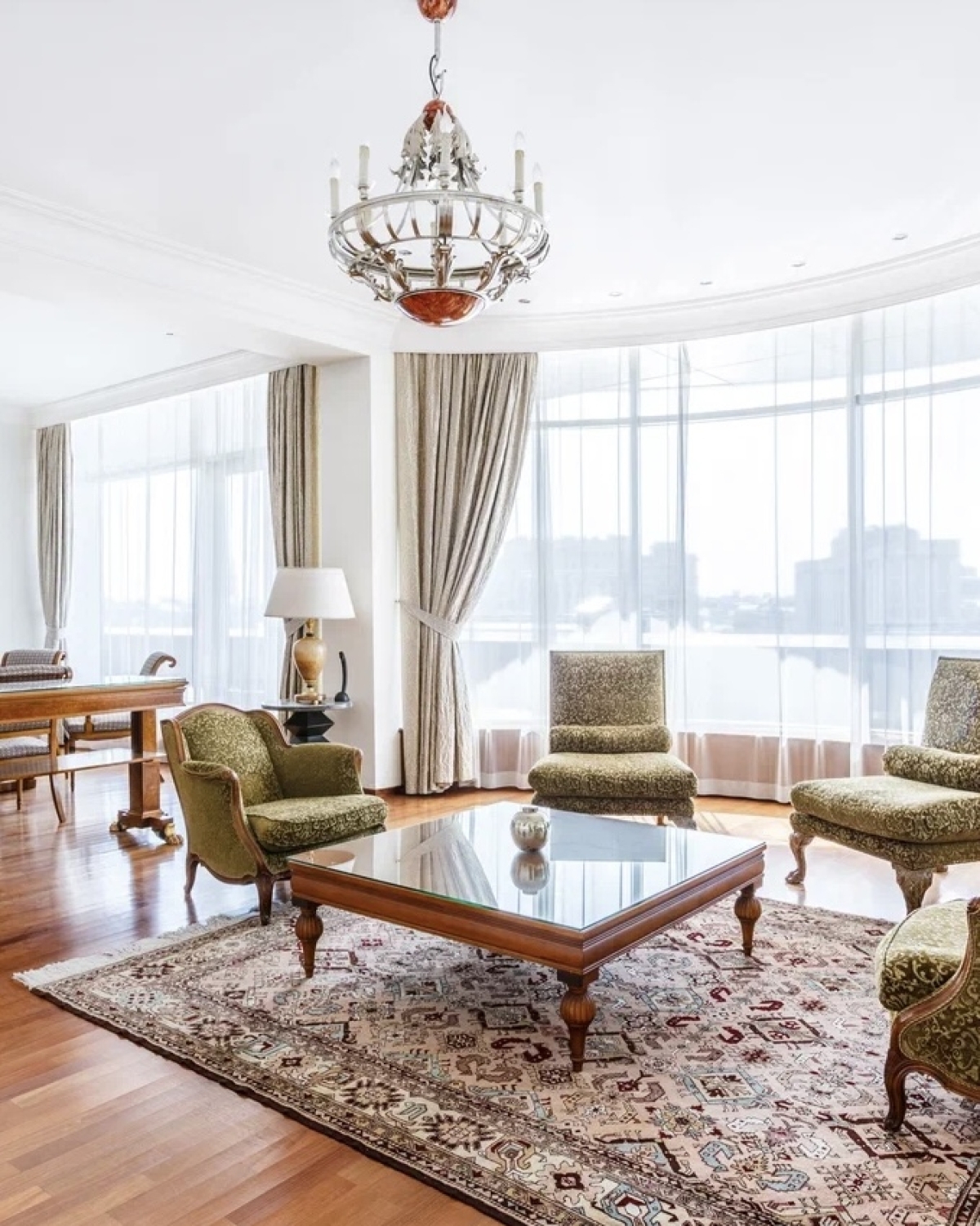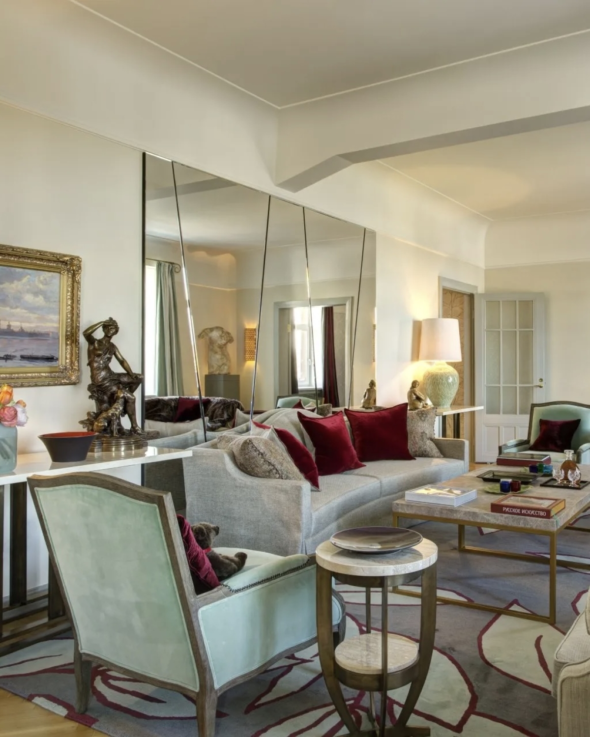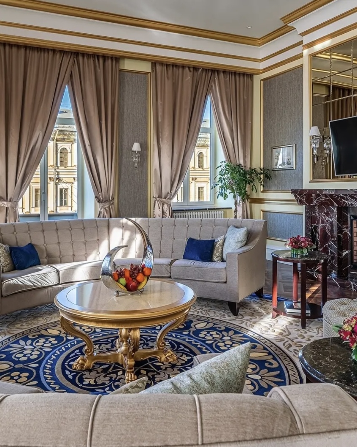 Расположенные на углу Невского проспекта и Михайловской улицы, апартаменты в «Гранд Отеле Европа» в стиле шинуазри занимают 350 квадратных метров. Щедрая планировка позволила разместить здесь кабинет с библиотекой, спальню с большой кроватью, тренажерный зал и даже сауну. Для камерной свадьбы здесь предусмотрены просторная гостиная, столовая на десять персон с полностью оборудованной кухней, лаунж-бар с видами на Невскую перспективу и музыкальный зал с антикварным роялем.
