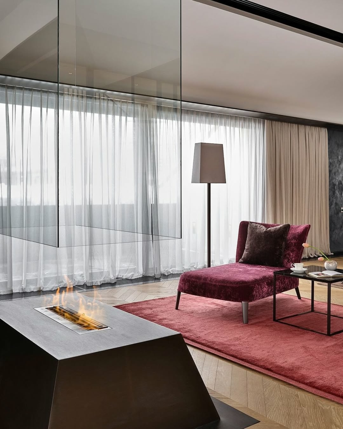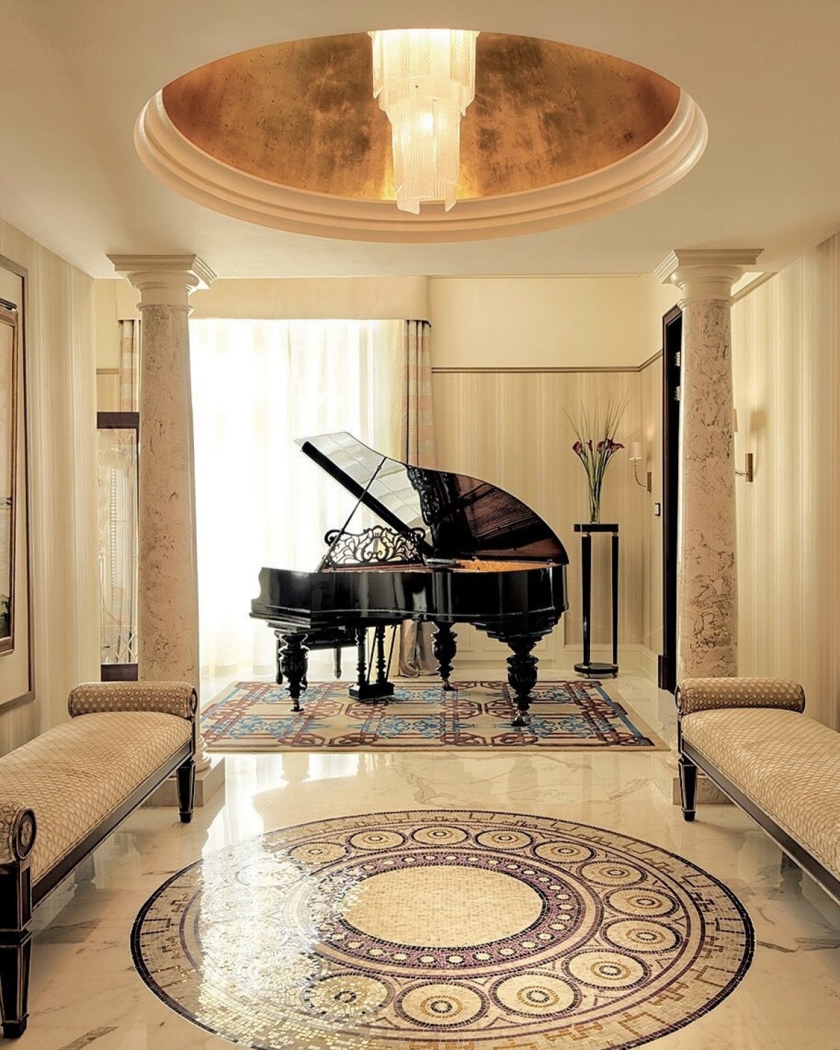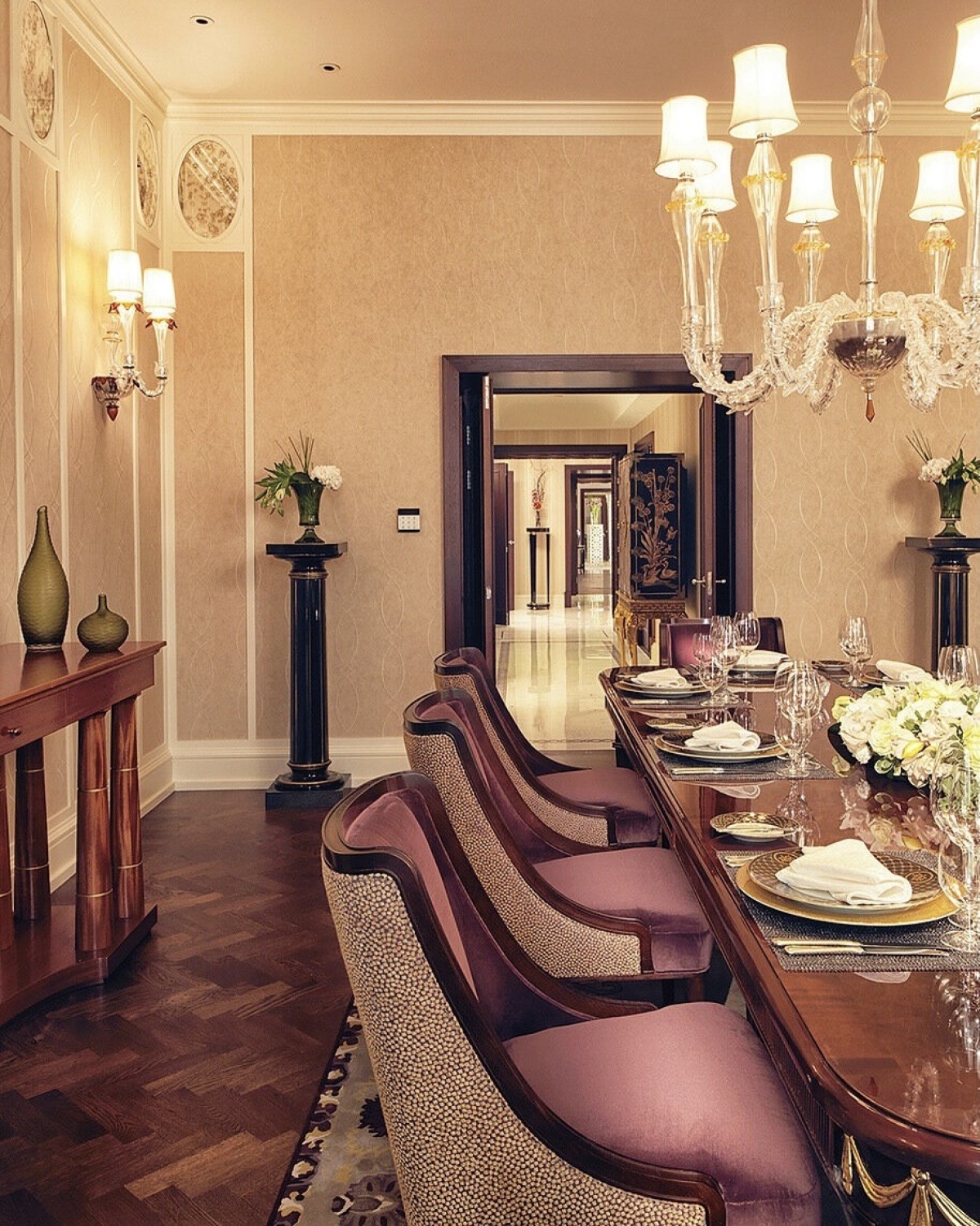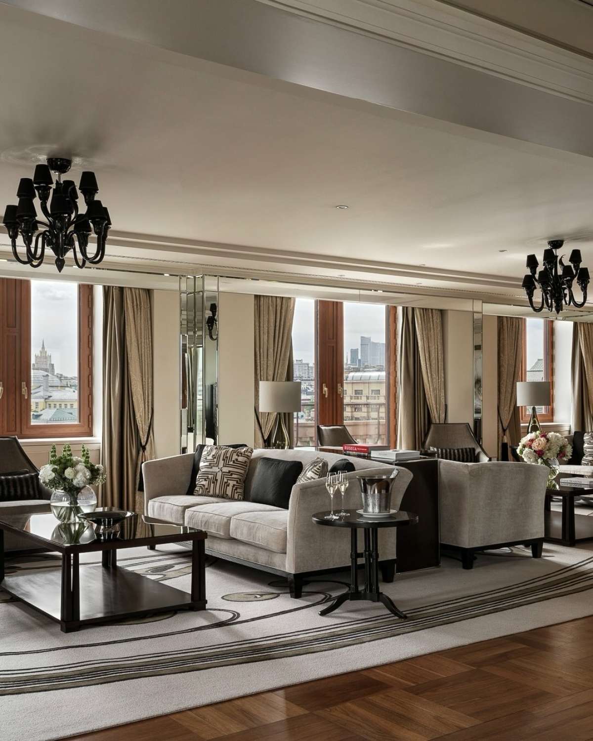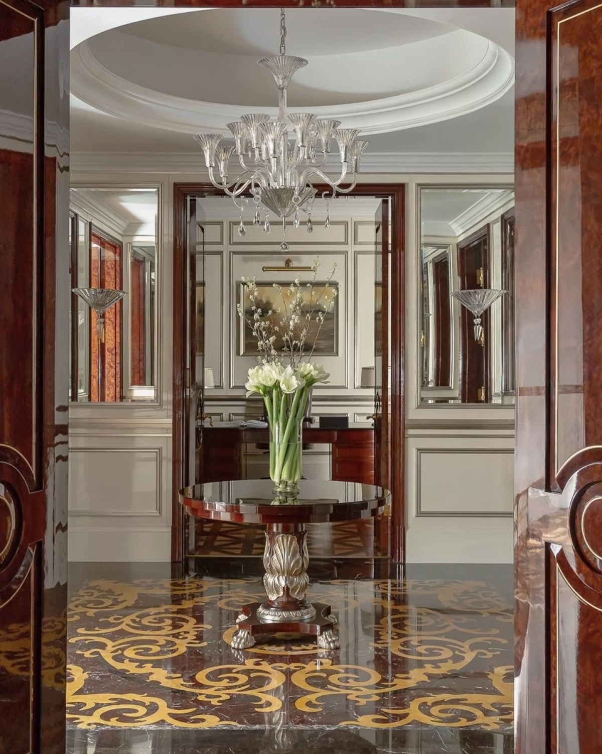 Расположенные на углу Невского проспекта и Михайловской улицы, апартаменты в «Гранд Отеле Европа» в стиле шинуазри занимают 350 квадратных метров. Щедрая планировка позволила разместить здесь кабинет с библиотекой, спальню с большой кроватью, тренажерный зал и даже сауну. Для камерной свадьбы здесь предусмотрены просторная гостиная, столовая на десять персон с полностью оборудованной кухней, лаунж-бар с видами на Невскую перспективу и музыкальный зал с антикварным роялем.