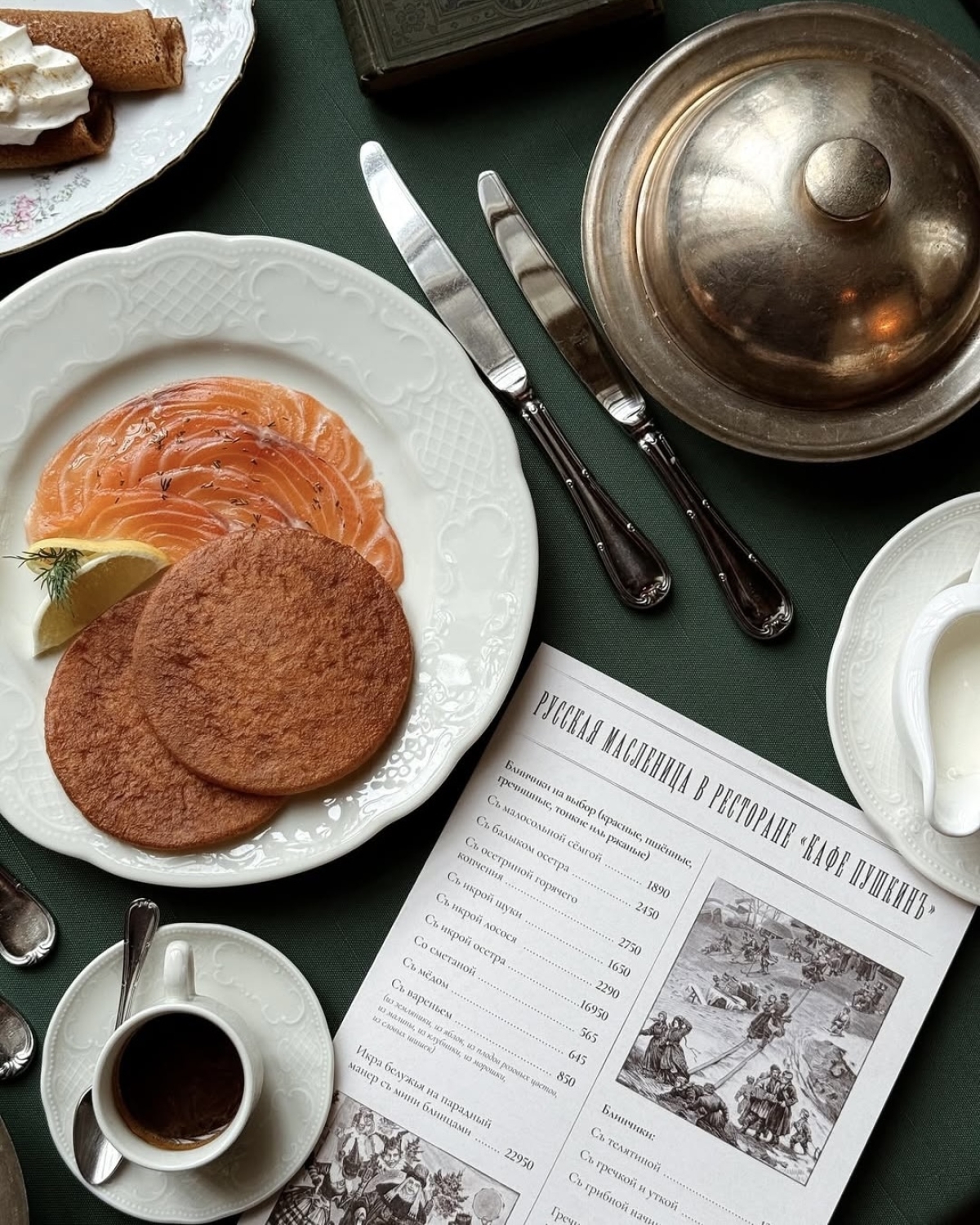 В легендарном «Кафе Пушкинъ» подают блины каждый день: пшеничные, гречишные, тонкие и ржаные. В качестве начинок предлагают томленые ягоды, икру трех видов, осетрину, гречку с уткой, топленый творог и безусловно сметану. Если вы из тех, кто честно соблюдает традиции русской Масленицы, то просто обязаны попробовать все и сразу.