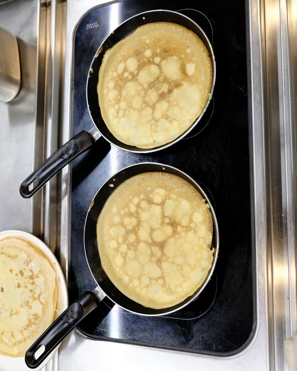 Фанаты хлеба и закусок из Masa Madre ликуйте. Всю неделю до 22 февраля в пекарне на Солянке (и в кафетерии на ВДНХ) команда поваров печет блины под любое настроение: с мясом и сметаной, яблоком и ананасом с асадора, классические с джемом из ревеня и клубникой, блинный торт с лососем и икорным соусом, а также фирменные — дульсе де лече.