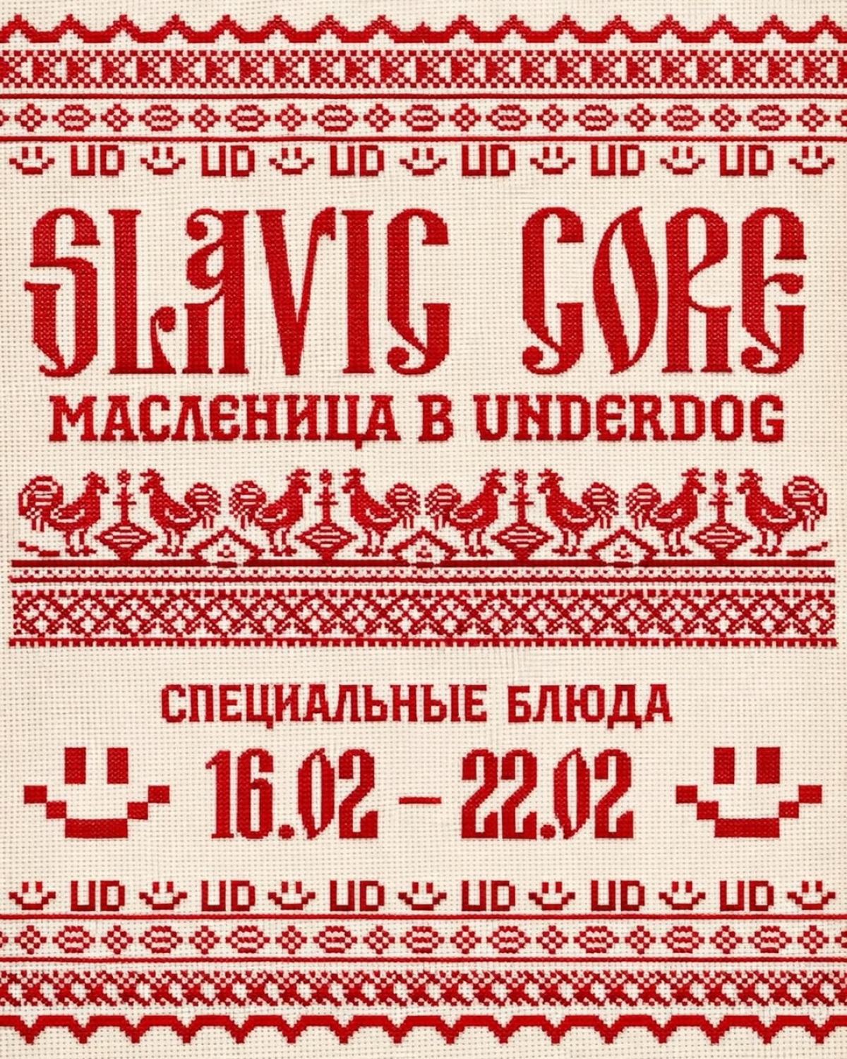 В Underdog пошли чуть дальше и решили устроить Масленицу в стиле Slavic core. В течение недели в заведении на Маросейке можно будет взять на пробу фирменные блюда, принадлежащие славянскому застолью: борщ, сет из настоек с запахом бани, оладушки с горкой красной икры, а также матча-блинчики с начинкой из творога. Ведь какое современное застолье без напитка из листьев зеленого чая?