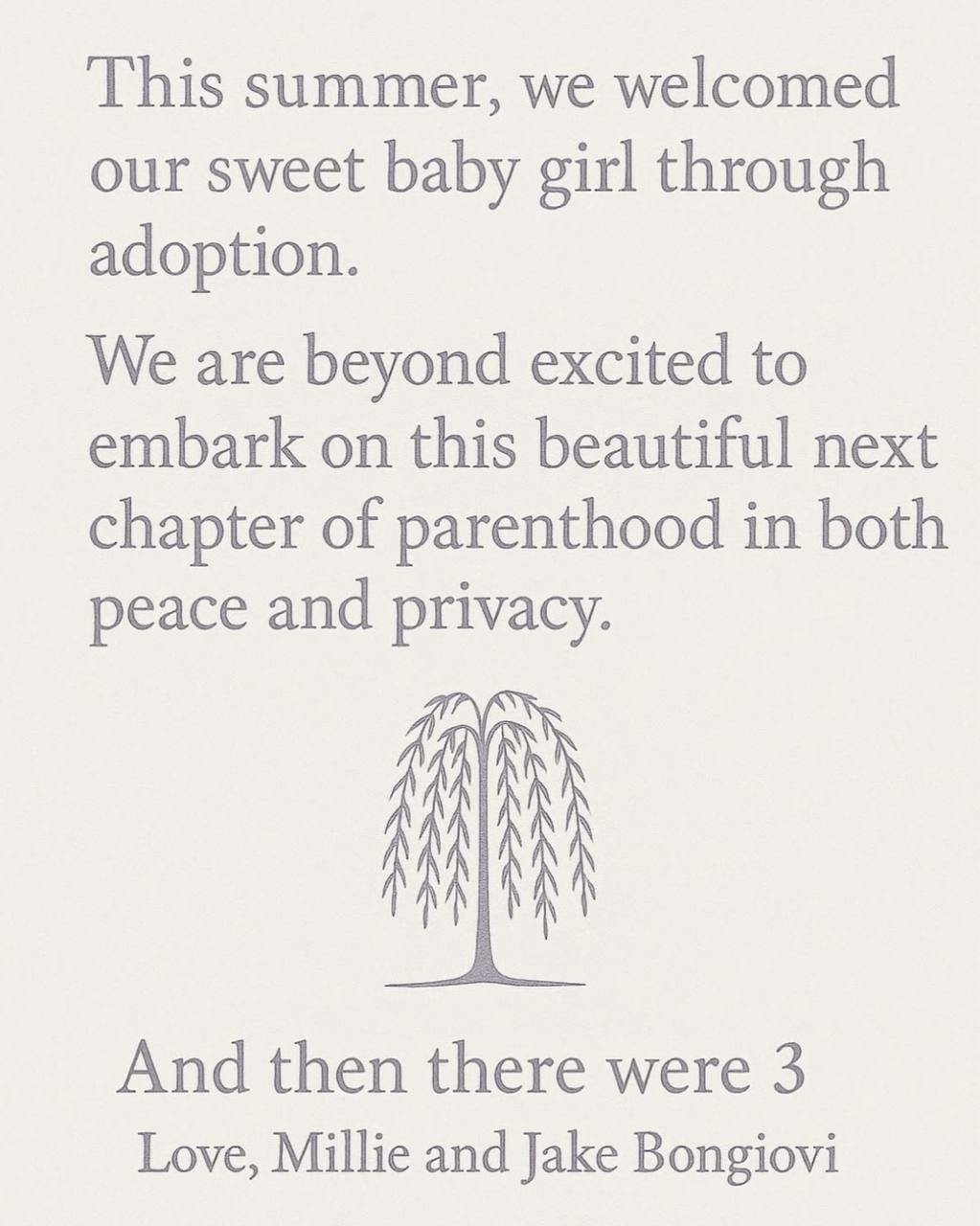Звезда «Очень странных дел» Милли Бобби Браун стала мамой. 21-летняя актриса и ее 23-летний муж, сын Джона Бонджови, Джейк удочерили девочку Лав. «Этим летом мы поприветствовали нашу милую девочку. Мы безумно рады начать эту прекрасную главу. Нас стало трое», — написала она в своих социальных сетях. В интервью Милли не раз признавалась, что мечтает о детях.
