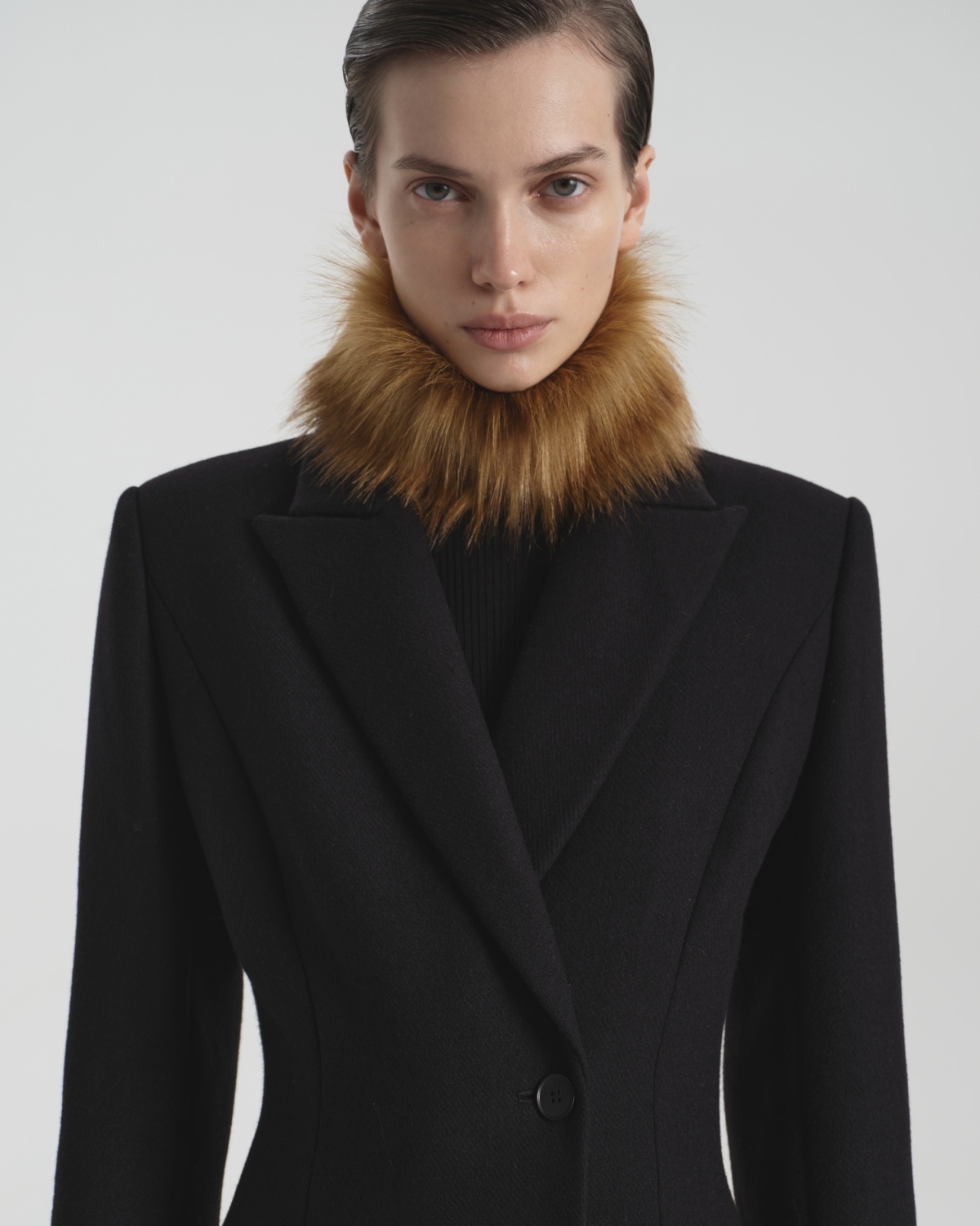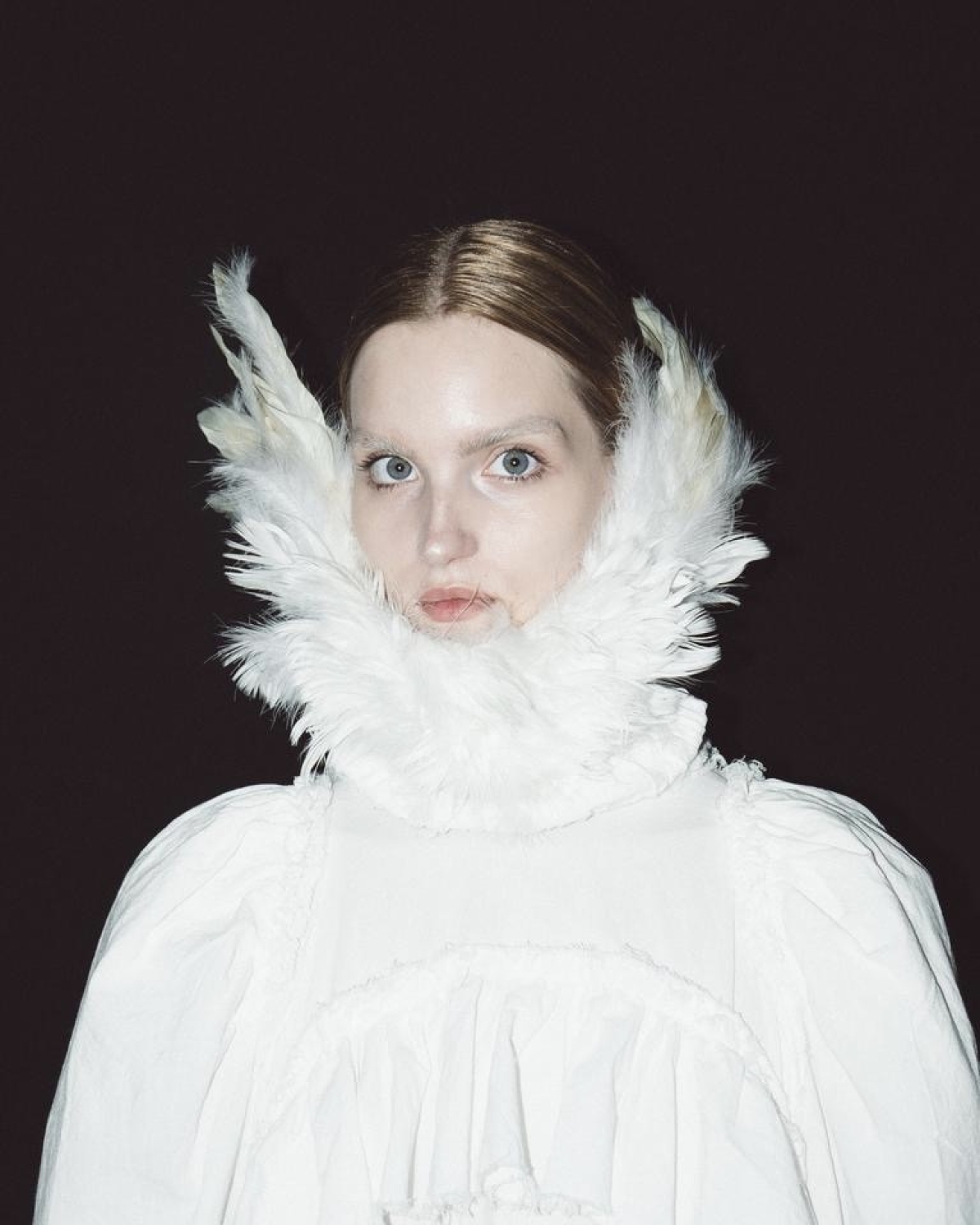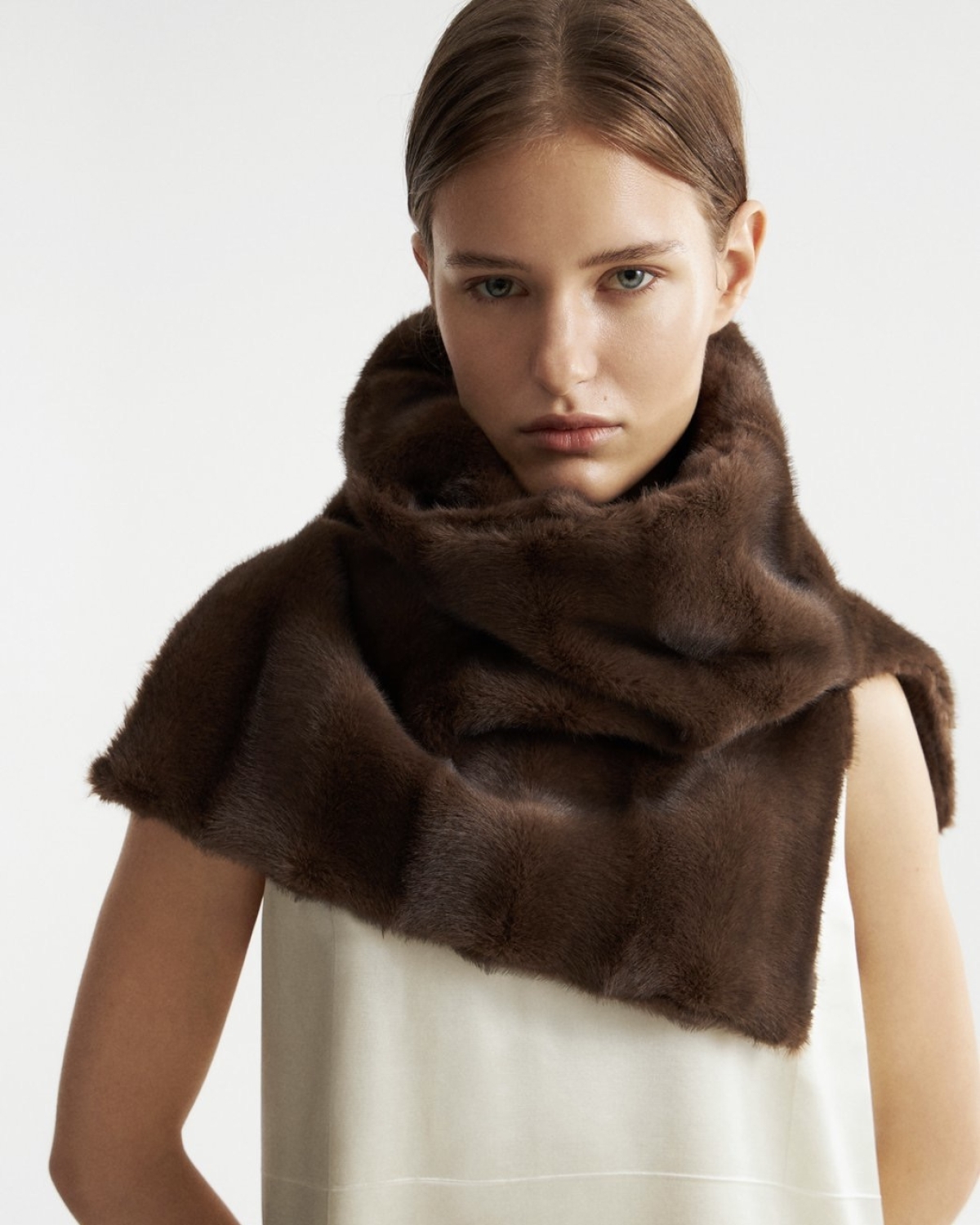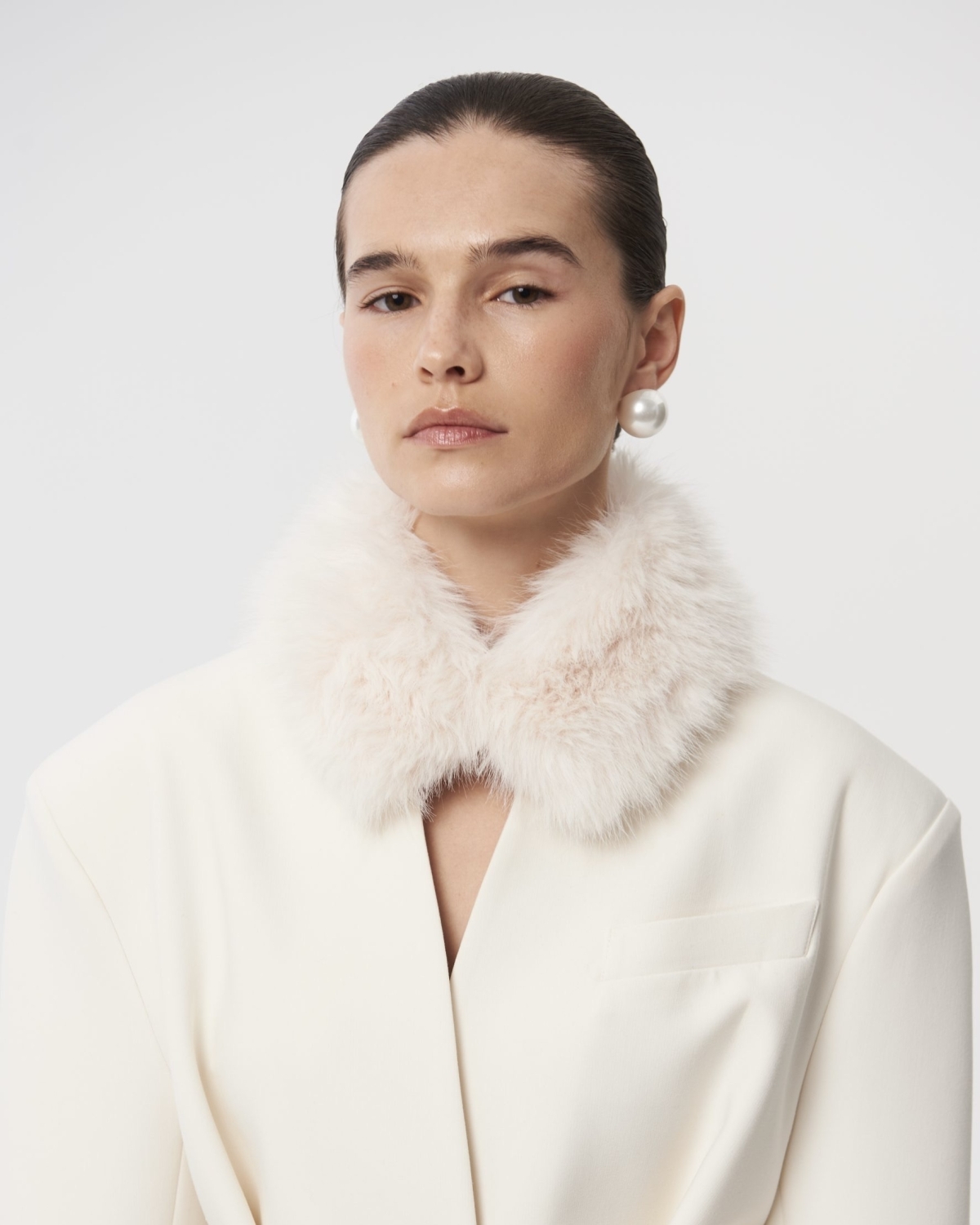 Невестам с глубоким декольте на платье предлагаем рассмотреть альтернативы повседневному шарфу и примерить воротники или манишки — из меха, шерсти или перьев. Стилизовать их можно по-разному: задом наперед, поверх пальто или под него. А если подобрать воротник или манишку в тон платью, образ можно трансформировать в течение дня, не снимая аксессуар, когда заходите в помещение.