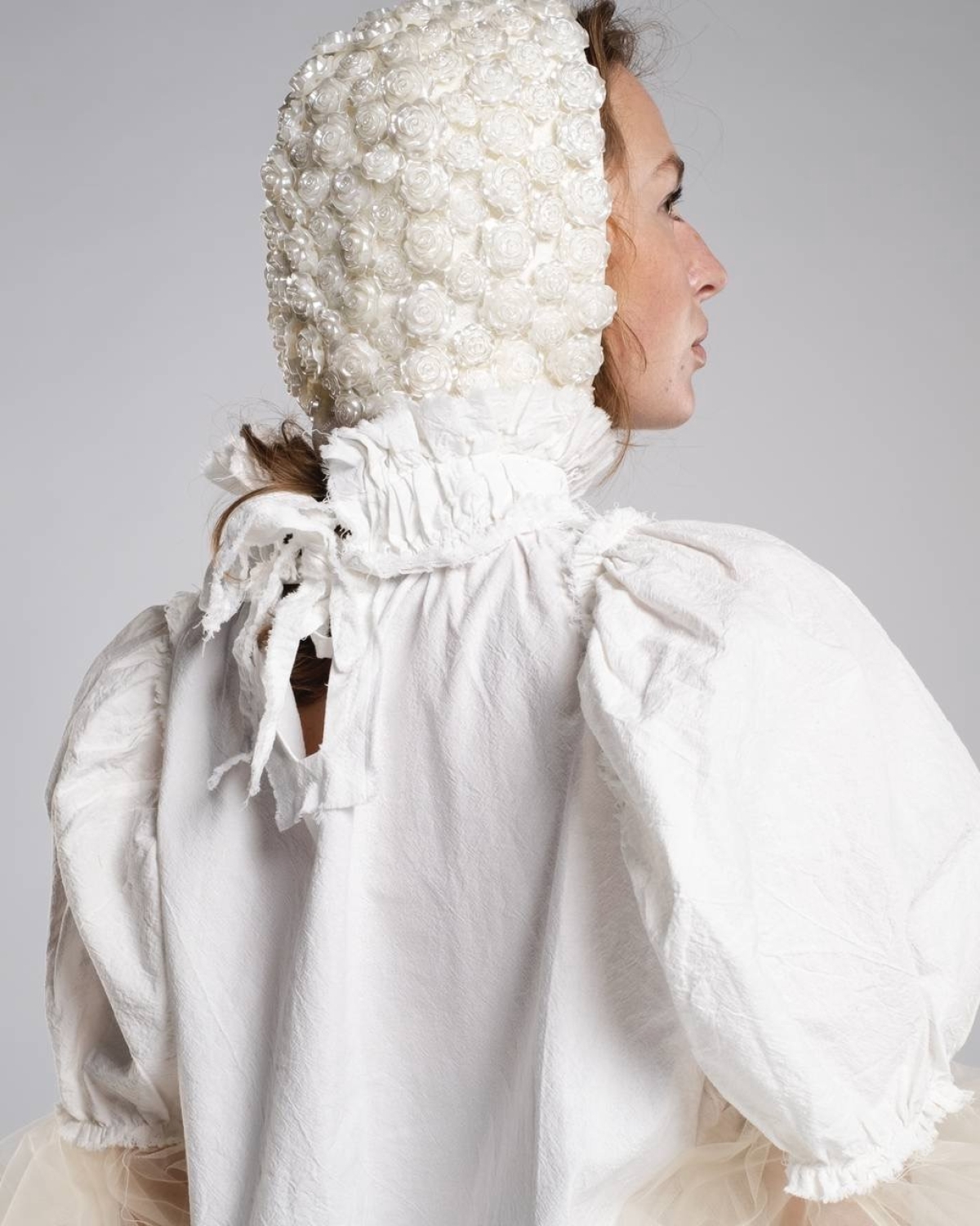 Некоторым невестам жизненно важно, чтобы головной убор был не только красивым, но и грел. В таком случае вместо шляпок выбирайте капоры и чепчики. При желании их тоже можно сделать частью основного образа и не надевать только на улицу, главное — угадать с плотностью и толщиной материала. Более того, если вместе с традиционной церемонией вы планируете зимнее венчание, нарядный капор или чепчик идеально подойдут под формат.