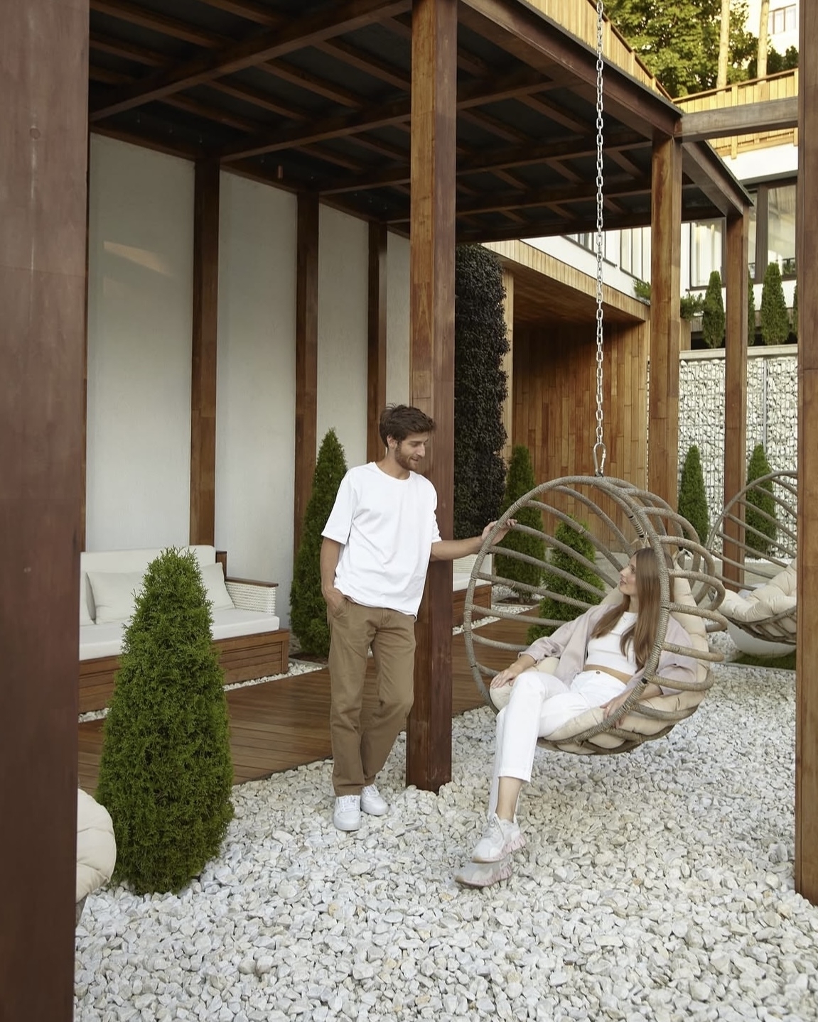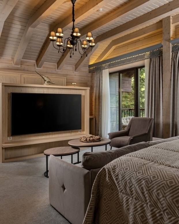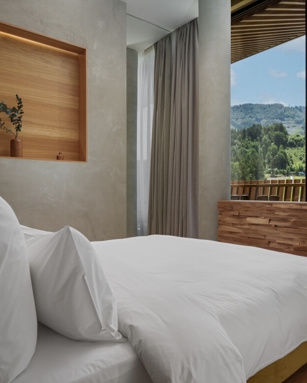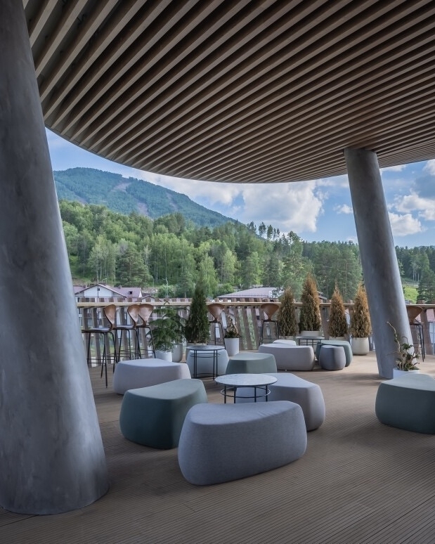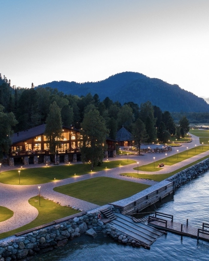 Гостям доступны сразу несколько вариантов размещения: пятизвездочный отель, гостиничный комплекс и видовые виллы. Что еще интереснее — один из самых масштабных спа-комплексов России, авторские ритуалы парения в горных алтайских банях и несколько ресторанов с разными концепциями. Отдельного внимания достойны интерьеры отеля, от и до пропитанные природой Алтая. Здесь дизайнерская мебель из массива деревьев и цельного камня, натуральная цветовая палитра и обтекаемые формы как главная отличительная особенность.