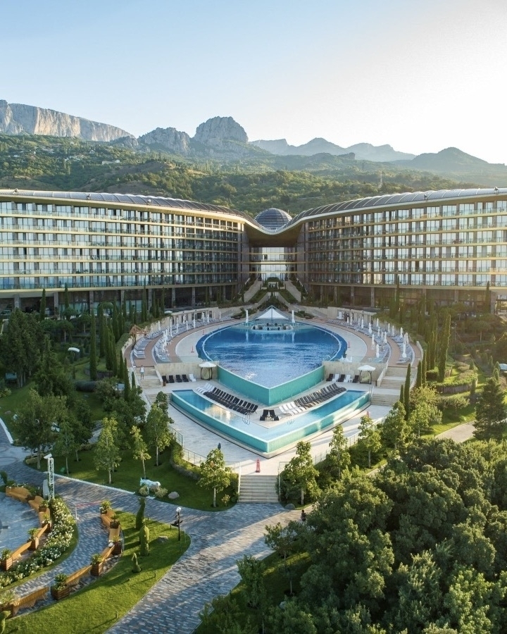 Мировой курорт Мрия премиум-класса (к слову, на его счету 31 международная, 26 европейских и 67 российских наград в сфере индустрии гостеприимства) — захватывающая локация для медового месяца. Отель расположен на южном берегу Крыма, в Ялте, между живописным горным массивом и поражает своими масштабами.