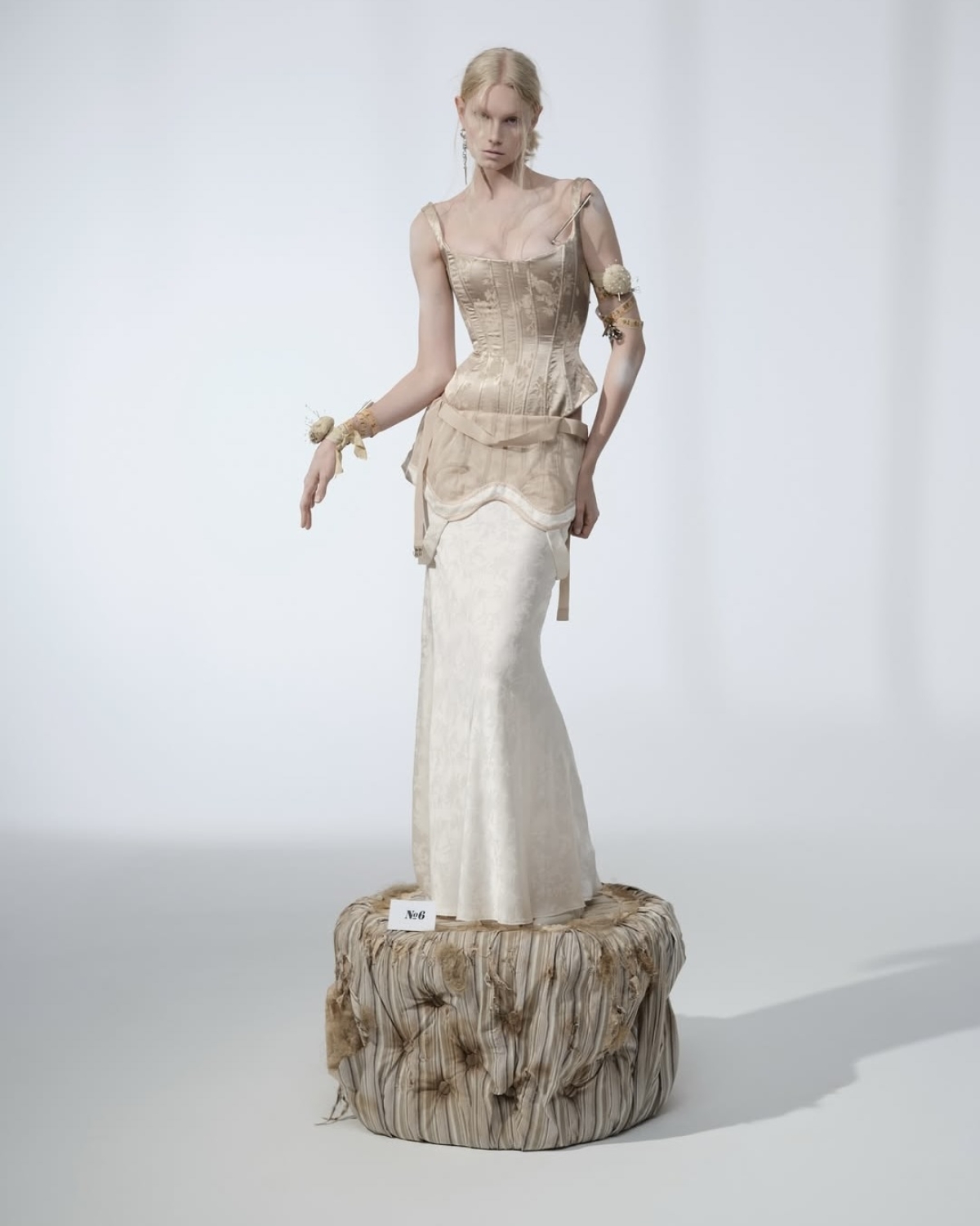 Ведьминская эстетика предлагает чуть больший выбор текстур. Отсюда в образе невесты могут появиться мох в букете, деревянные элементы в виде поясов и каблуков и колье-амулеты.