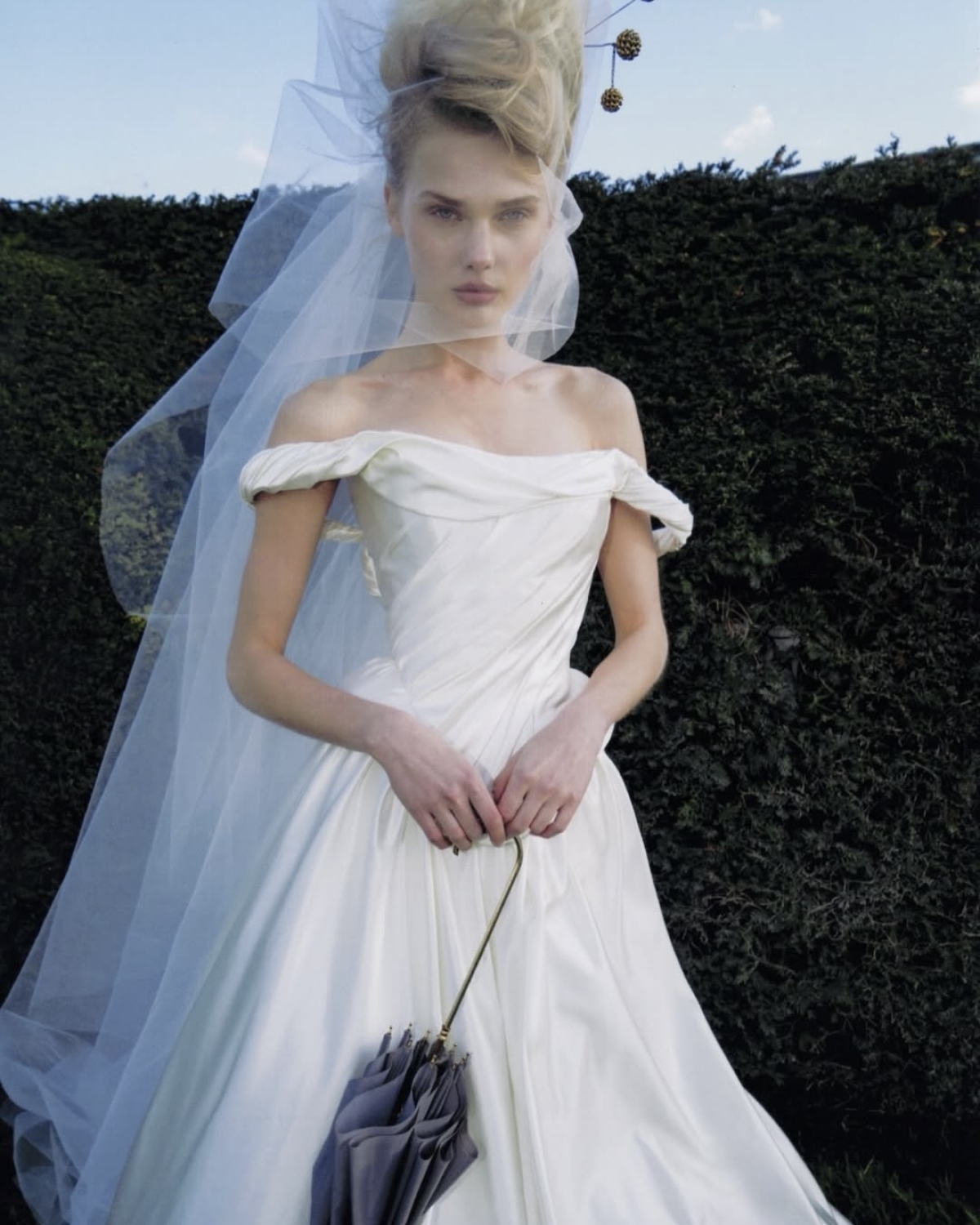 Классическая готика — более понятная эстетика. Это темная палитра, жесткие фактурные силуэты, закрытые строгие образы, часто уходящие в траур. В свадебной готике появляется воздух и романтизм, и черный становится уже не главным оттенком, а дополнением к традиционной церемониальной гамме — от молочно-белого до кремового. Силуэты трансформируются в более мягкие, а на смену трагедии приходит глубокая вечная любовь.