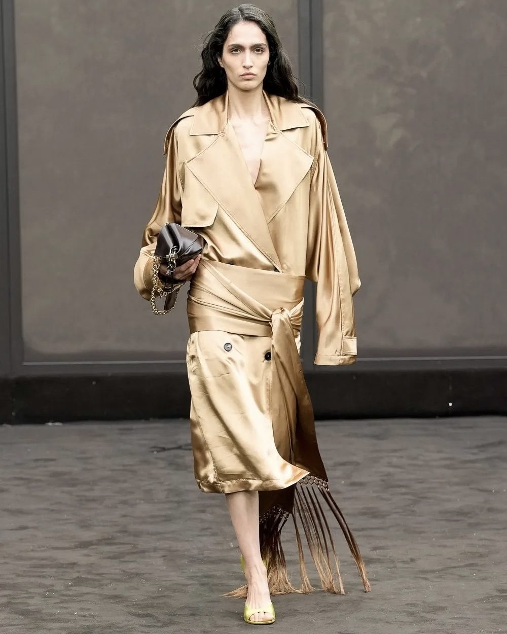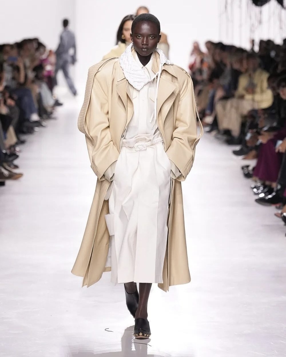 За дебютом Луиз Троттер в Bottega Veneta модная публика следила с придыханием. Первая причина: в должности она сменила уже сроднившегося с брендом Матье Блази (он теперь в Chanel) и стала первой женщиной на посту креативного директора аж с 70-х. Причина вторая: Луиз показала откровенно красивую женскую линию. И вещи из кожи в фирменном плетении Intrecciato стали ее хайлайтом: жакеты, брюки, клатчи и даже воротнички тренча. Кожаной была и верхняя одежда, которую мы будем носить в следующем сезоне стараниям не только Троттер, но и ее коллег из Sportmax и Tod’s.