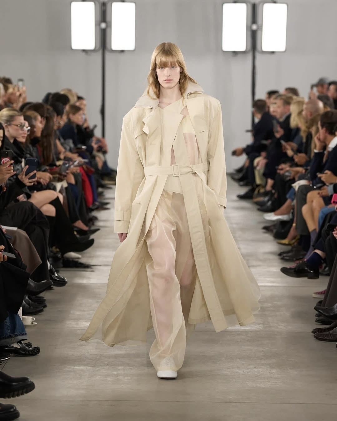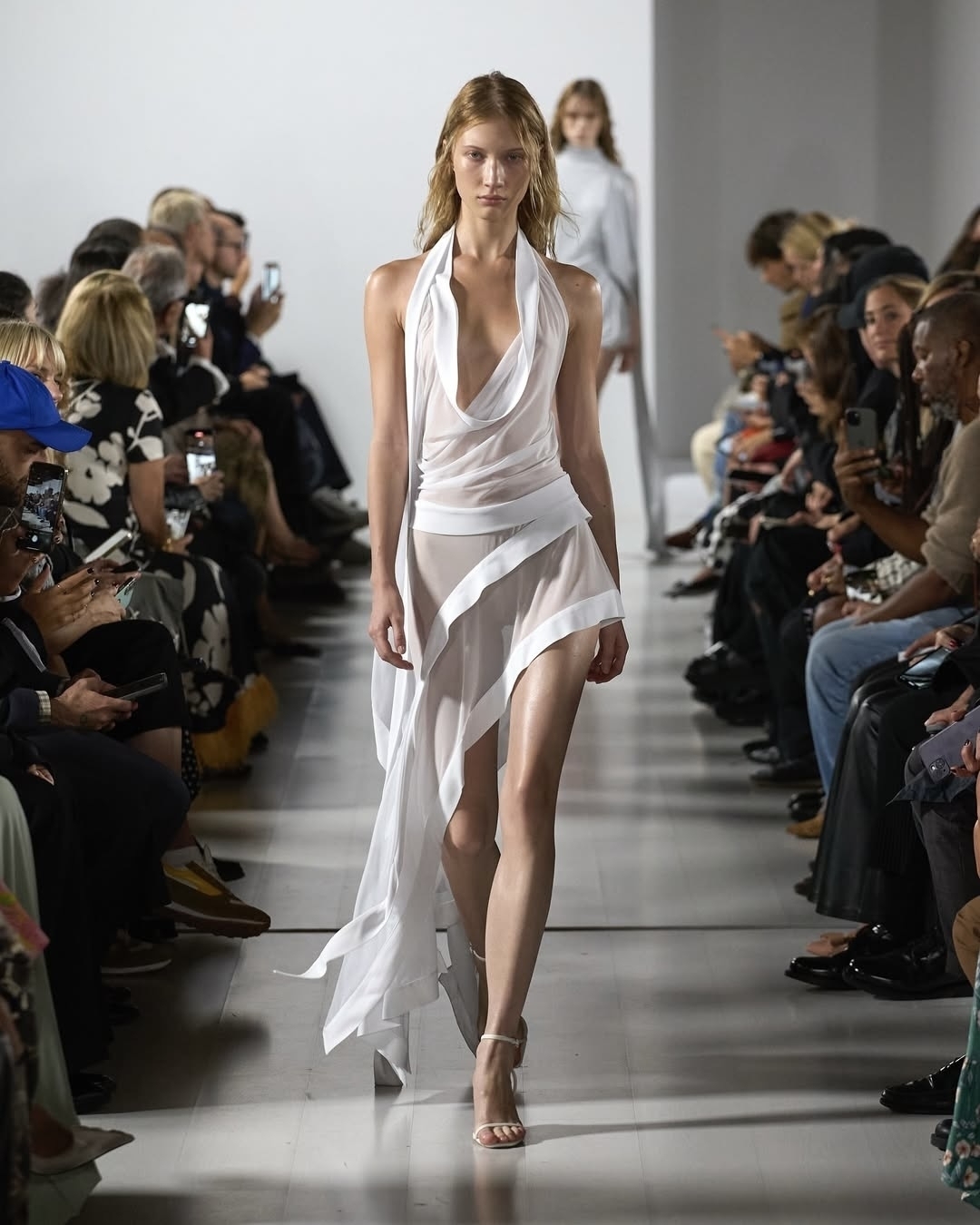 Списать со счетов прозрачность пока не выйдет. Дебютант миланской Недели моды весна-лето 2026 Francesco Murano сочинил оду женственности длиной в 27 невероятных образов. Модели носили просвечивающие платья с обтекаемыми силуэтами и драпировками и почти невесомые белые костюмы, которые игриво прикрывали плотной верхней одеждой. Похожий трюк применили Sportmax, которые, видимо, прочитали наш материал о том, как деликатно носить прозрачные вещи.