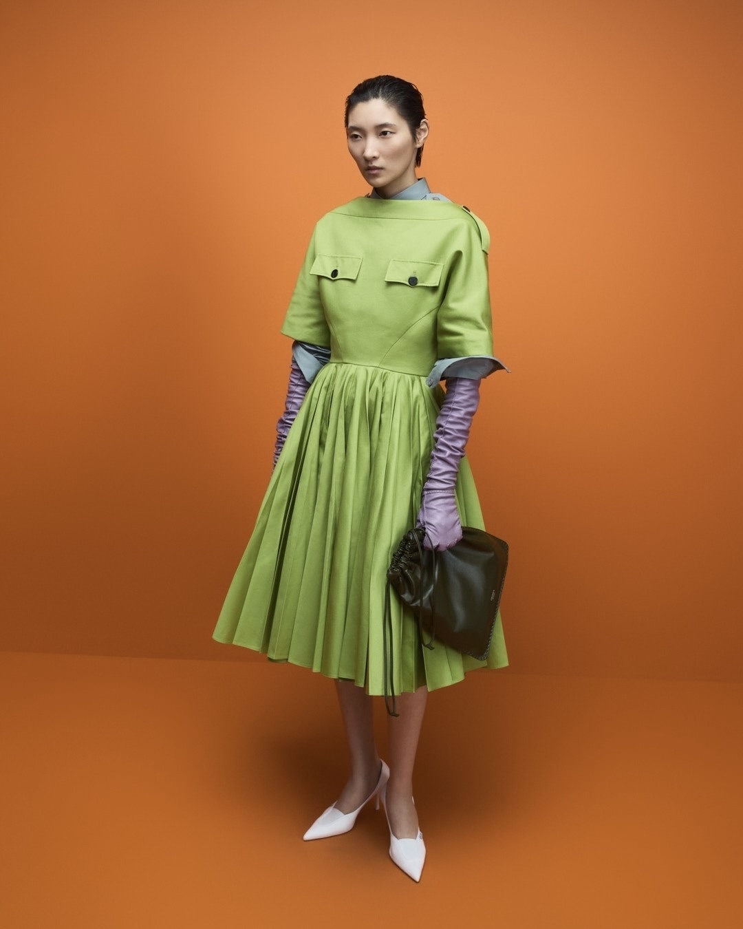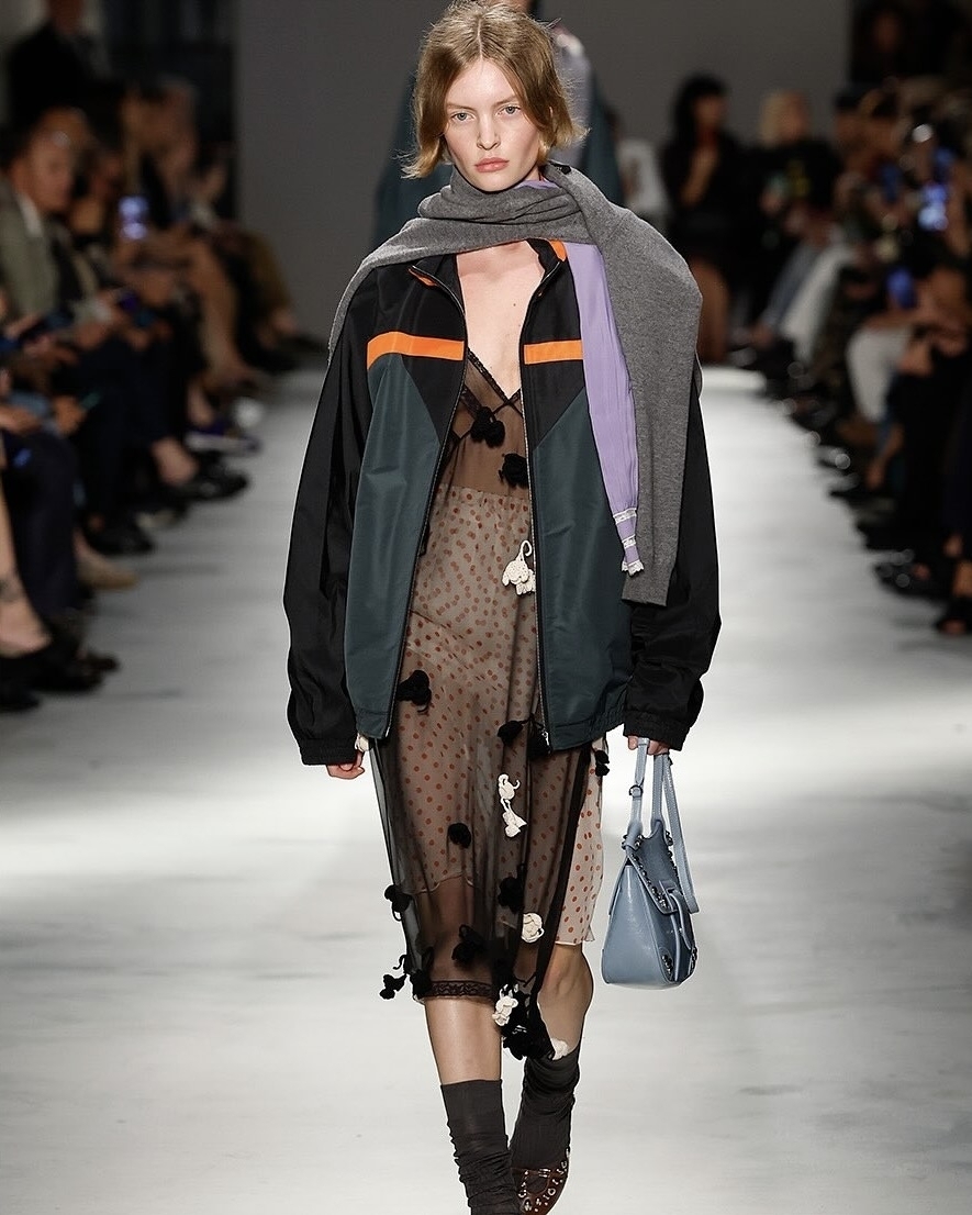 На показе Prada Миучча и Раф Симонс снова переосмыслили униформу рабочего и показали напоминающие спецодежду яркие куртки, комбинезоны, рубашки и платья. Их дизайнеры дополнили неожиданными нарядными перчатками из кожи и атласа. No. 21 сделали чуть проще: накинули форменную ветровку на легкую комбинацию. Почти не стараясь, так удастся пойти и на прогулку, и на вечеринку.