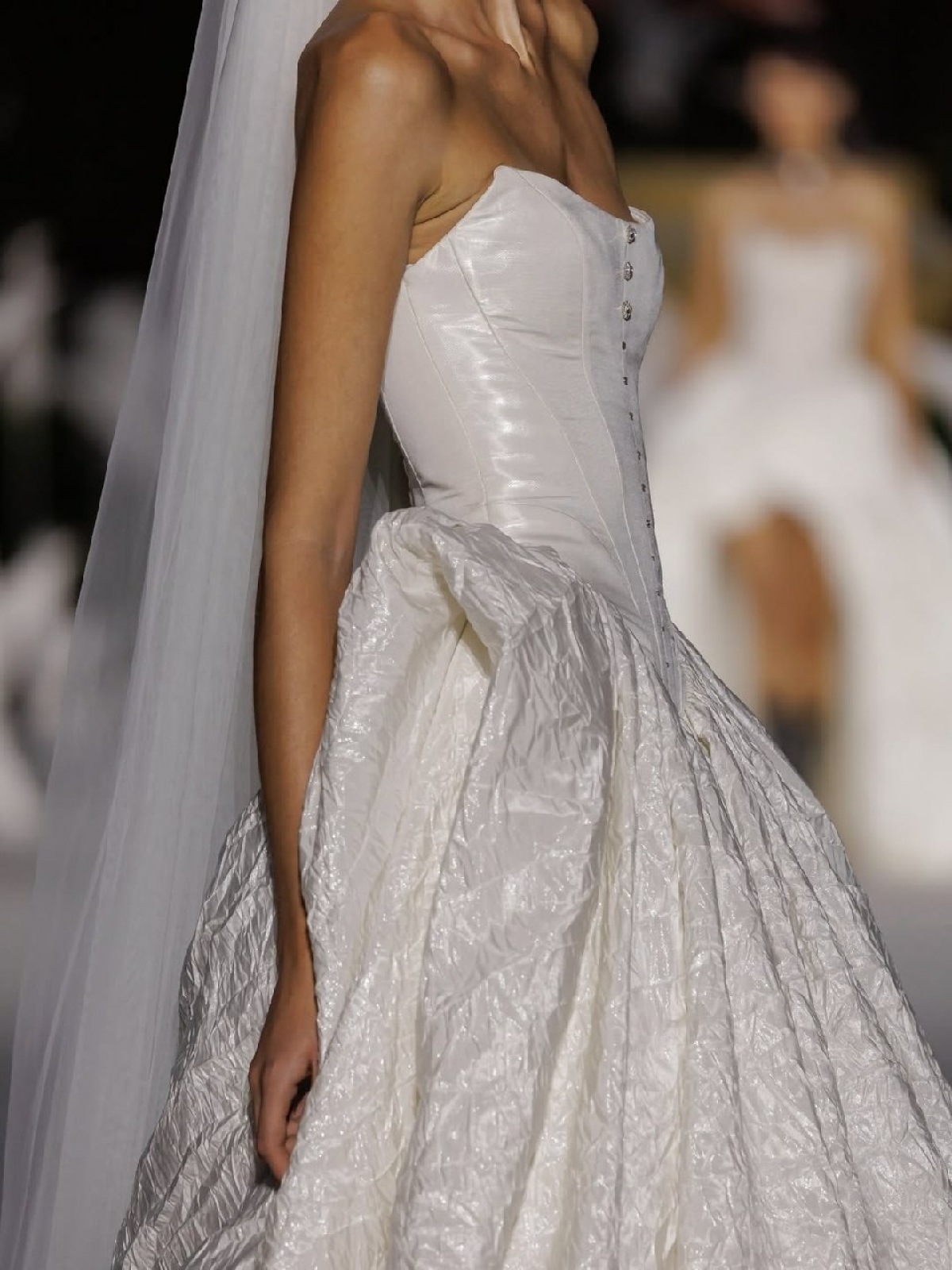 Завершением модного дня стали образы Pronovias, предложившие окунуться в мир бантов, вышивки и бисера, и Allure Bridals, которые представили как приталенные модели с длинными шлейфами, так и пышные варианты с объемными юбками и корсетами.