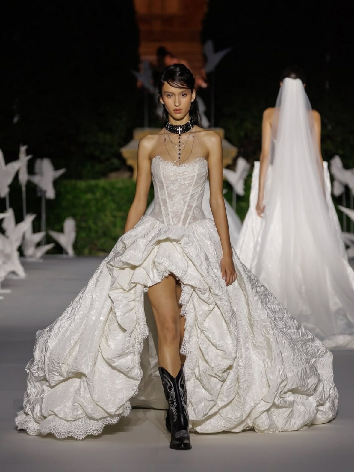 Следом состоялась «Свадебная ночь на Монжуике». Внушительную порцию платьев из 80 нарядов под названием Love for Peace от кутюр представил Stephane Rolland. Моделями в первом дефиле выступили 20 студентов из творческих вузов Барселоны, которых команда дизайнера курировала в рамках проекта Sculpted by Nature.