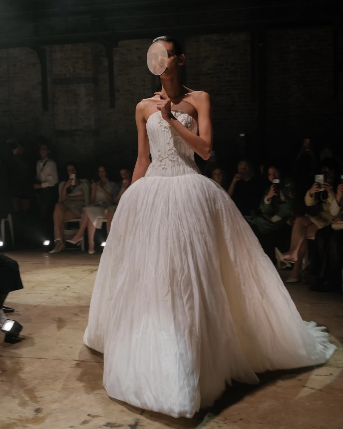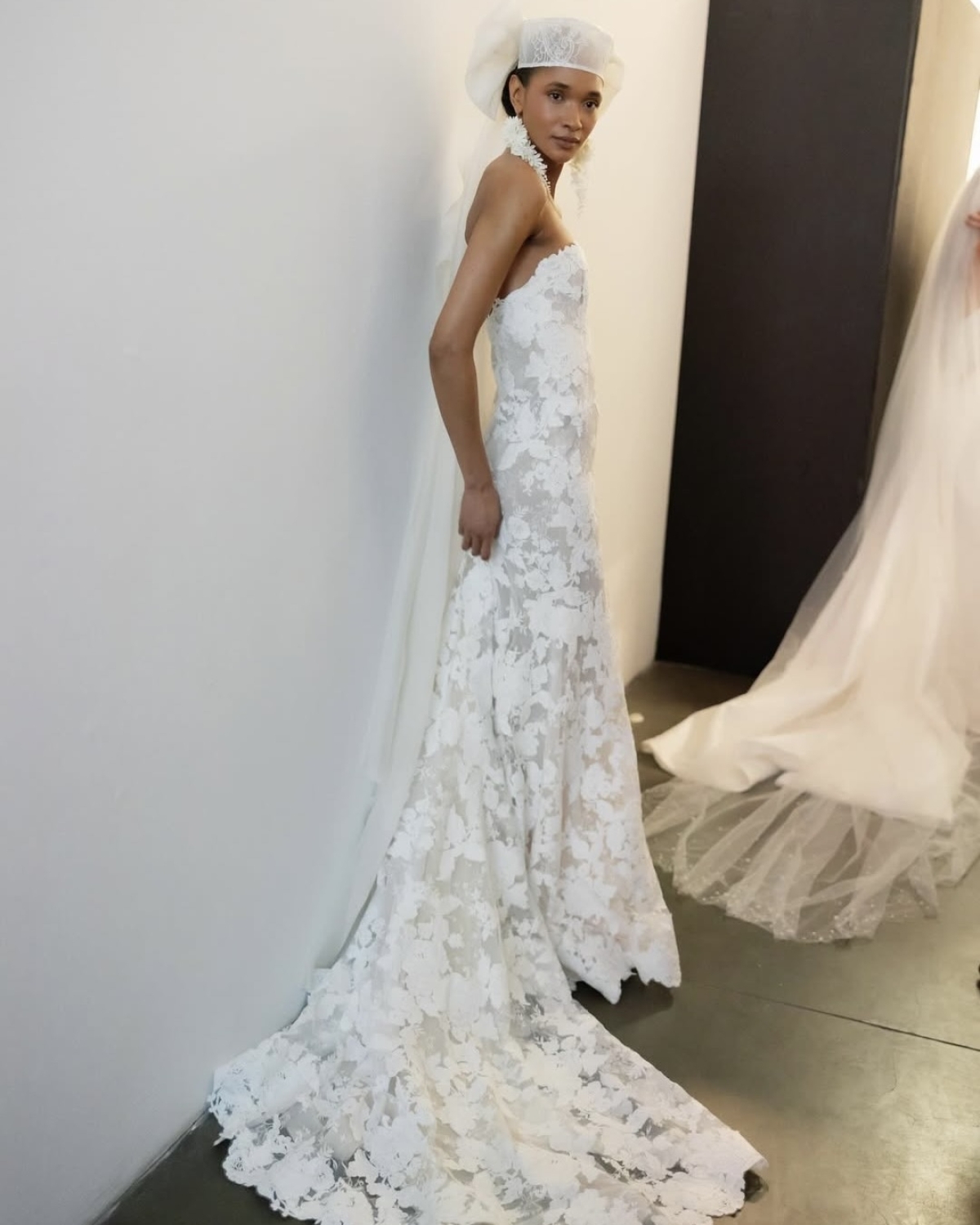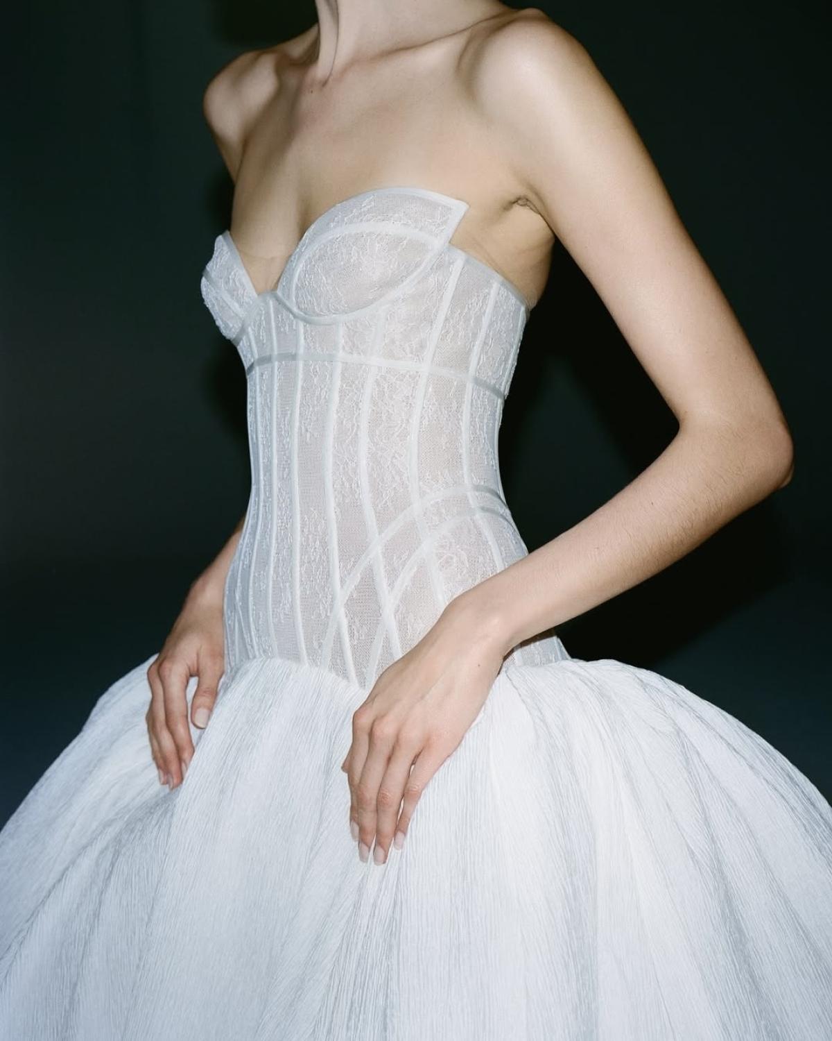 В свадебном сезоне весна-лето — 2027 кружево трансформируется, и вместо тонкого французского на первый план выходит плотное, объемное и с фантазийными узорами. Бренд Lihi Hod предлагает сочетать небанальное кружево с простыми, но смелыми силуэтами и аксессуарами из той же ткани. Так образы выглядят свежо и по-прежнему традиционно.