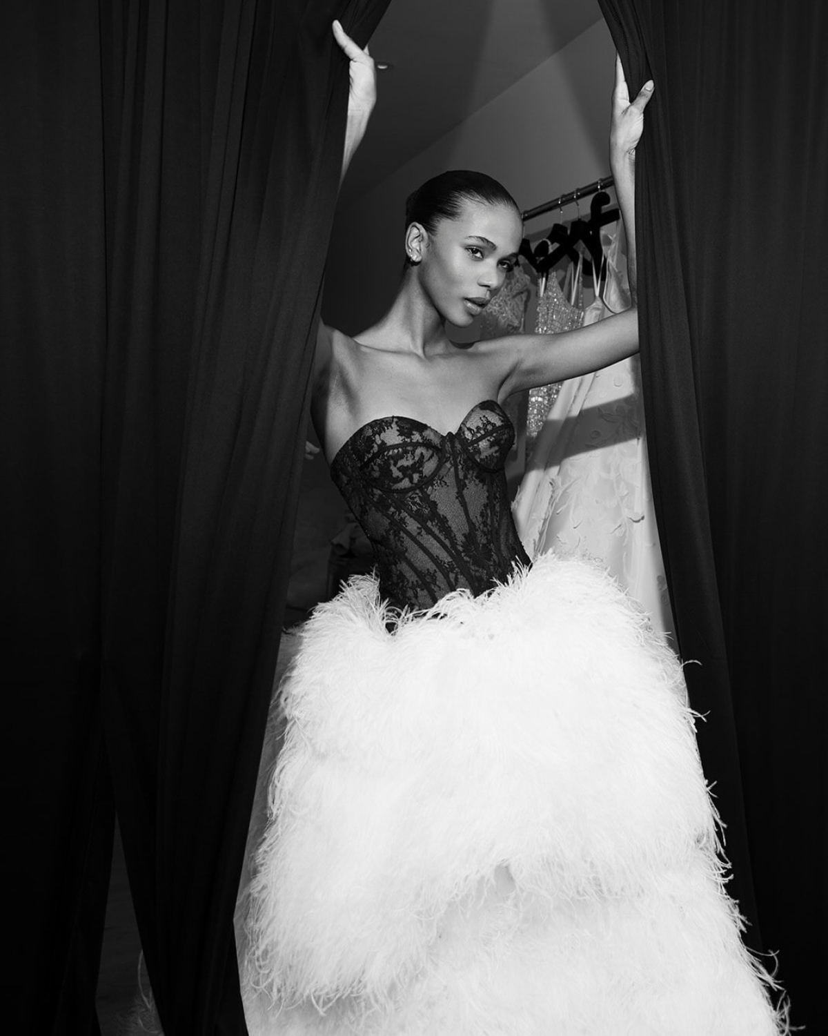 Кроме акцентного декора, Nicole Felicia предвещают еще один тренд для невест — сочетание черного и белого в одном образе. Делается это не столько за счет аксессуаров, сколько с помощью игры на контрастах в дизайне самого платья. Тут темный топ идет в паре со светлой юбкой, а декоративная отделка противопоставляется по цвету всему образу.