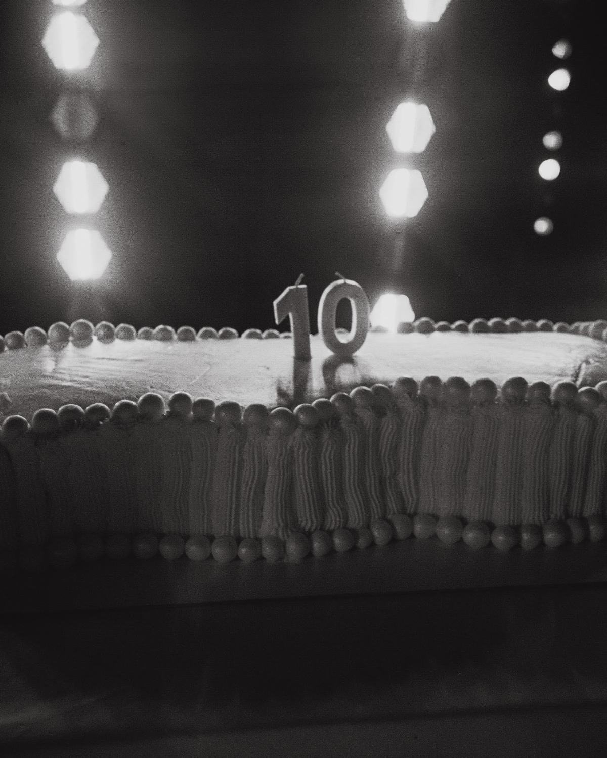 И конечно, наш свадебный торт — украшенный свечами в форме числа 10, в честь десятилетия наших отношений.