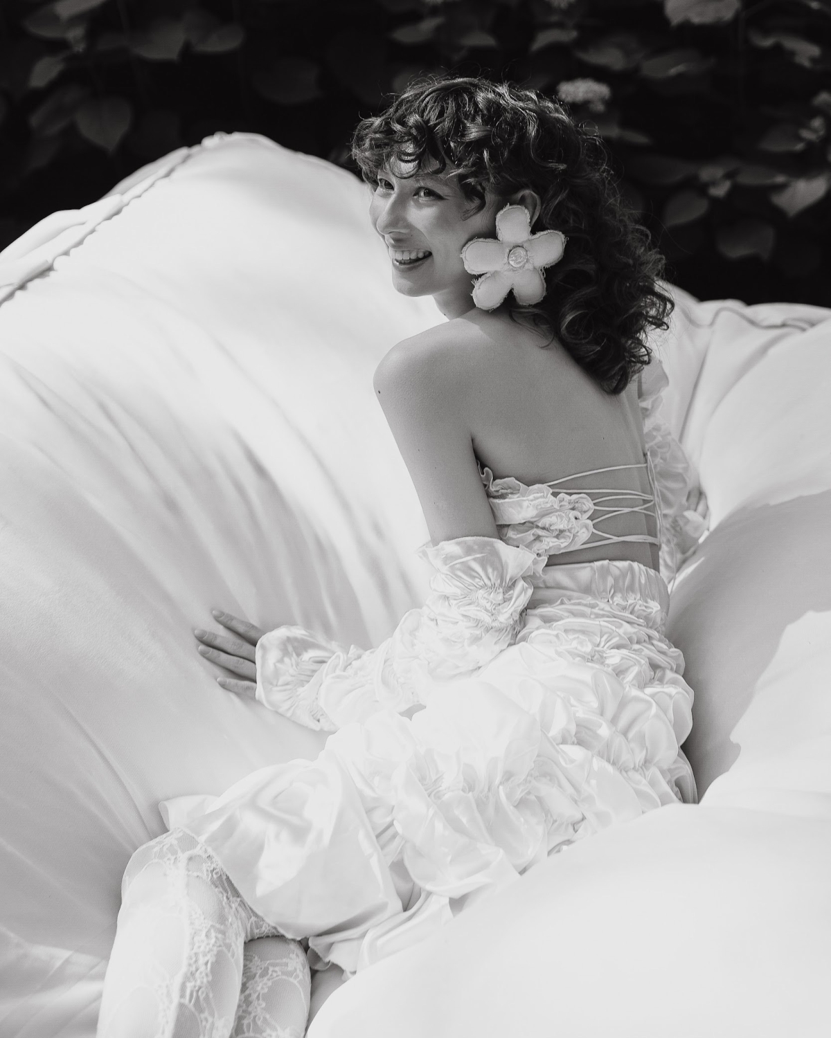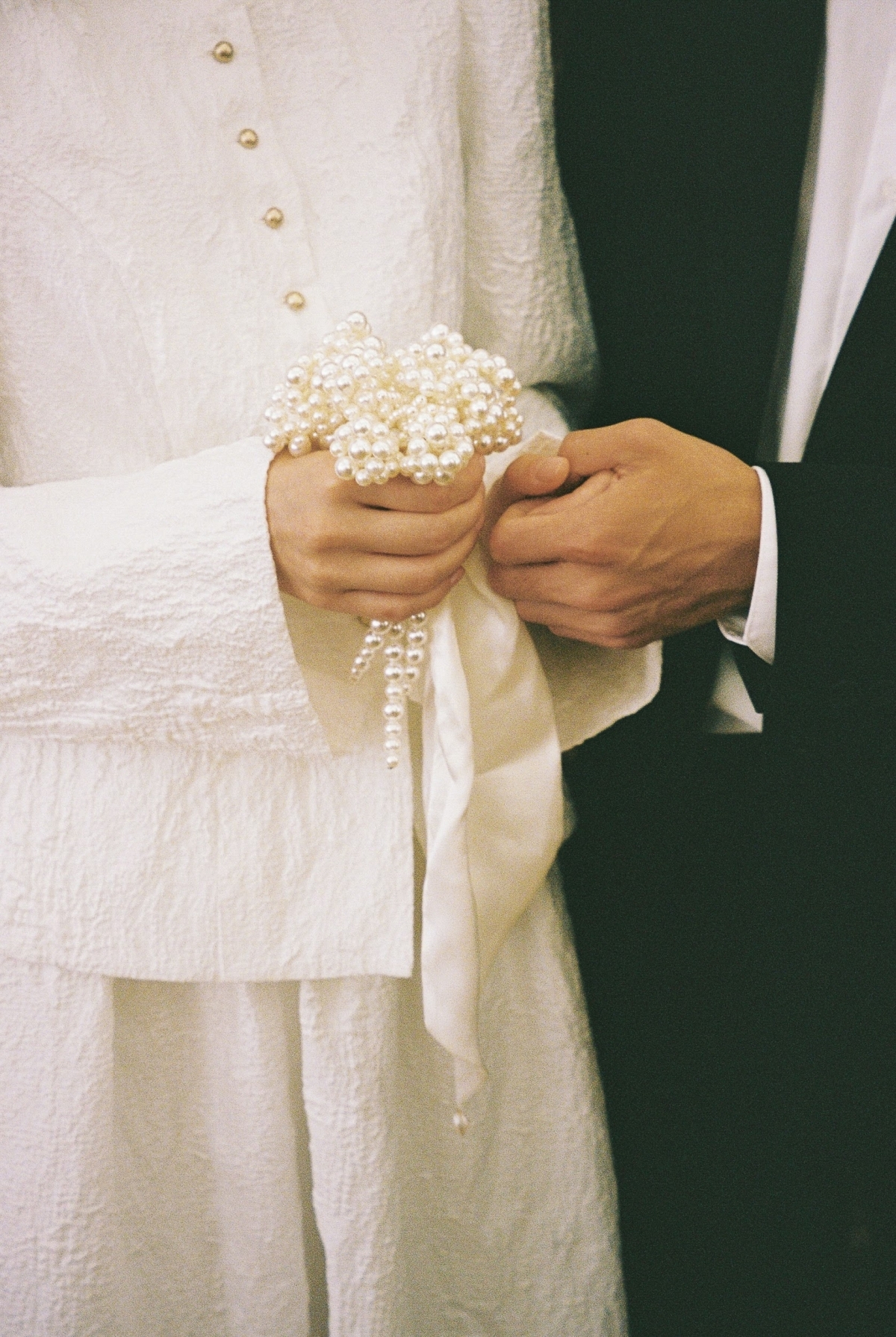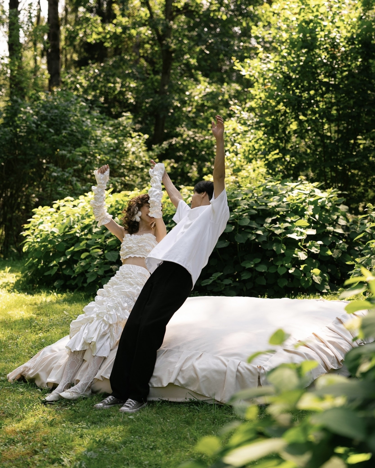 Главное платье для церемонии я нашла больше года назад — случайно наткнулась на фото показа Simone Rocha и сразу влюбилась: цветочные мотивы, необычные детали — все, что близко моему стилю. Коллекция уже была распродана, но я случайно обнаружила это платье в отметках бренда у маленького магазинчика в Ирландии и с помощью байера доставила его. Оно оказалось не белым, а пастельно-зеленым — но я увидела в этом даже плюс: оно усилило образ «цветка», который я хотела воплотить в этом дне. К платью я добавила уникальные аксессуары Насти Бурьян на заказ: фату с россыпью лепестков и колье-розу, оплетающее шею.