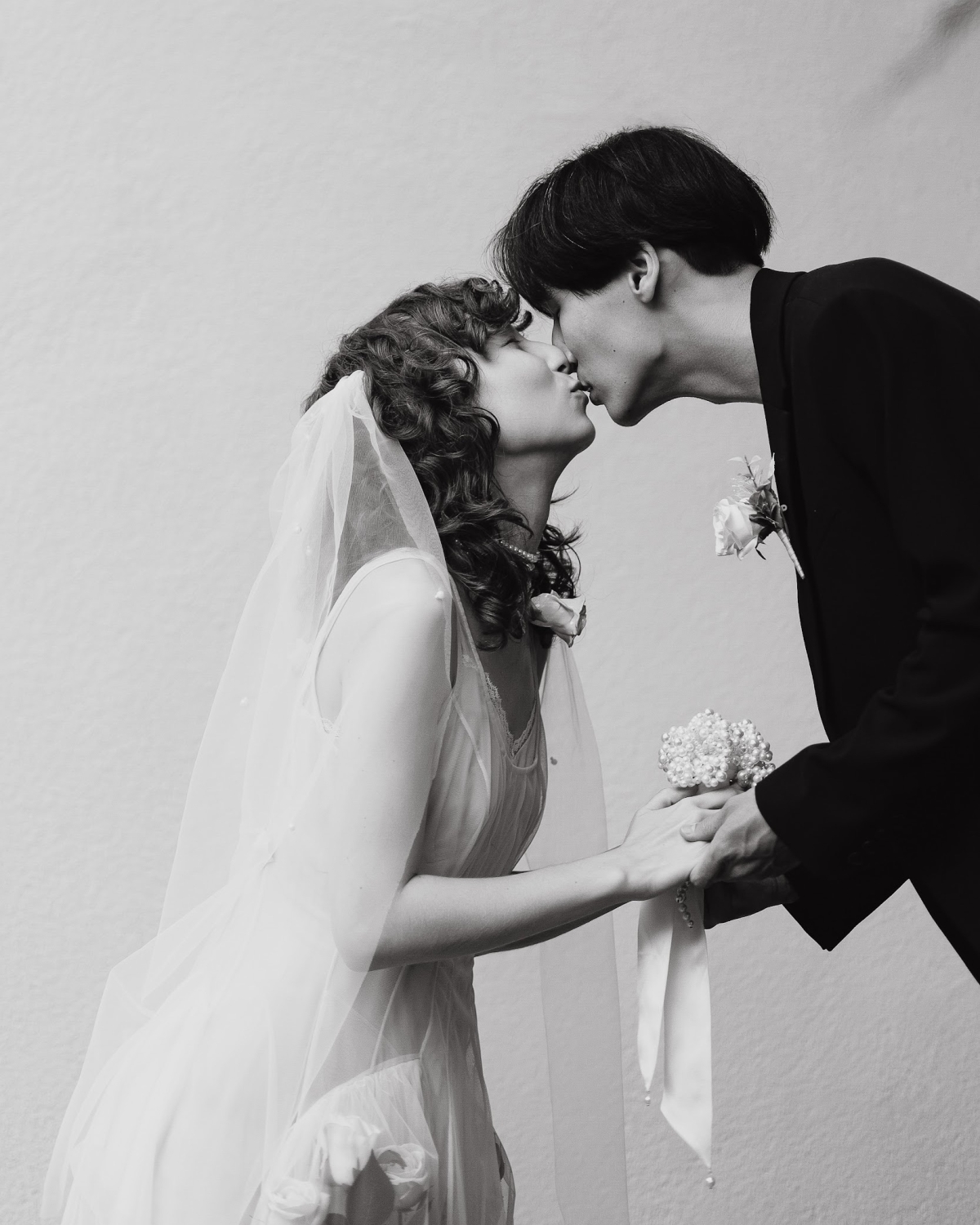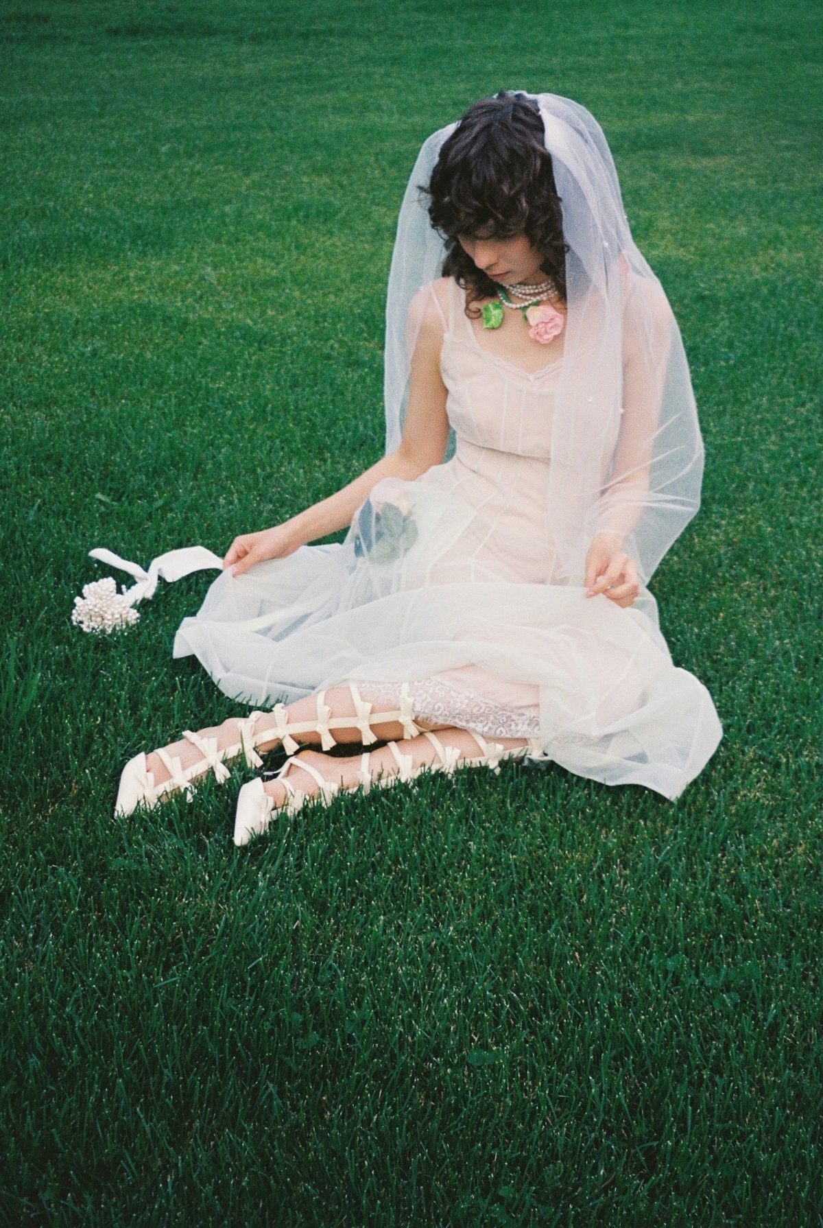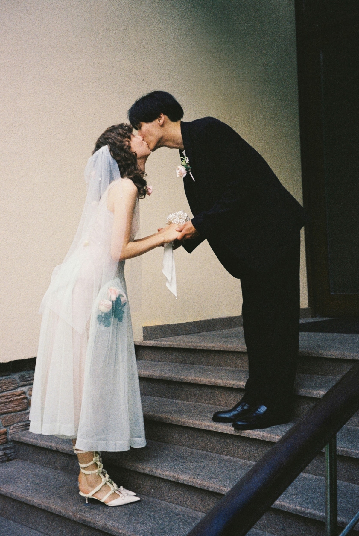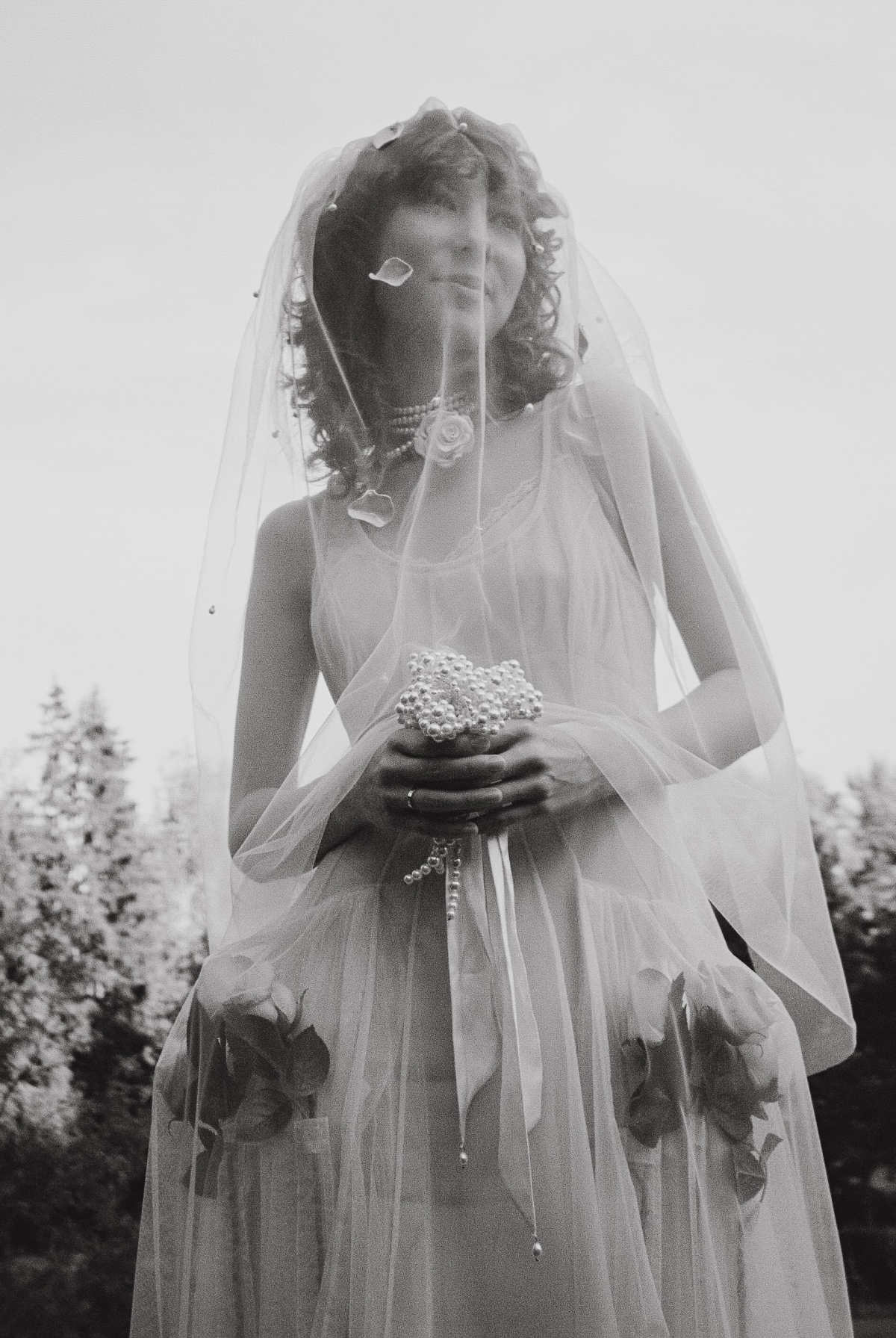 Главное платье для церемонии я нашла больше года назад — случайно наткнулась на фото показа Simone Rocha и сразу влюбилась: цветочные мотивы, необычные детали — все, что близко моему стилю. Коллекция уже была распродана, но я случайно обнаружила это платье в отметках бренда у маленького магазинчика в Ирландии и с помощью байера доставила его. Оно оказалось не белым, а пастельно-зеленым — но я увидела в этом даже плюс: оно усилило образ «цветка», который я хотела воплотить в этом дне. К платью я добавила уникальные аксессуары Насти Бурьян на заказ: фату с россыпью лепестков и колье-розу, оплетающее шею.