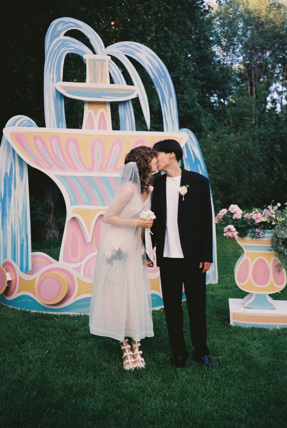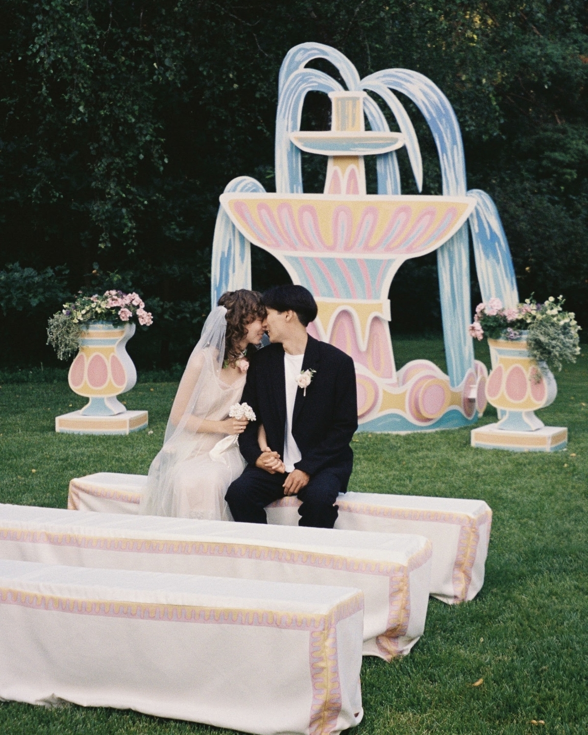 Декор получился как будто из снов или сказки: нежные формы, пастельные оттенки, легкая наивность. Особенно тронуло, как воссоздали фонтан в зоне церемонии — он стал центральным арт-объектом и символом дня. Все выглядело очень цельно, воздушно и при этом нестандартно.