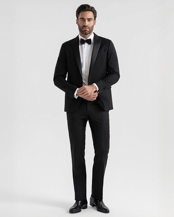 Смокинги KANZLER выполнены из премиальных смесовых тканей: точная посадка, сатиновый блеск лацканов, пуговицы в тон добавляют образу контраста, а крой slim fit формирует аккуратный и собранный силуэт.