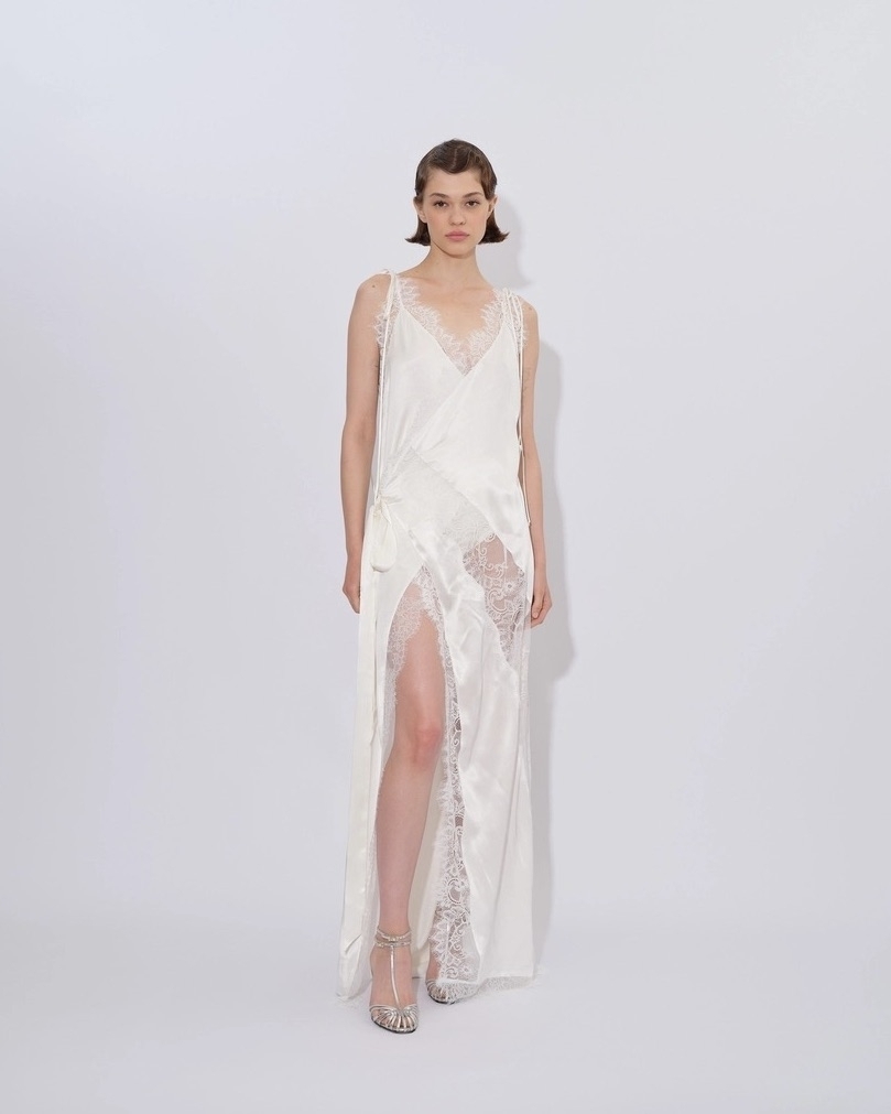 Бессменная свадебная классика для любого формата — платье-комбинация. В таком и в ресторане поужинать, и под венец пойти. Но мы были бы не мы, если бы не предложили доиграть его спортивной или грубой курткой. Тем более, погода пока переменчивая и без верхней одежды вряд ли получится обойтись. Обращайте внимание на фактуру куртки, играйте на контрастах или подбирайте оттенок в тон платья, присмотритесь к комбинации с легкой отделкой или без декора вовсе. В любом случае, акценты всегда можно добавить украшениями и сумками.