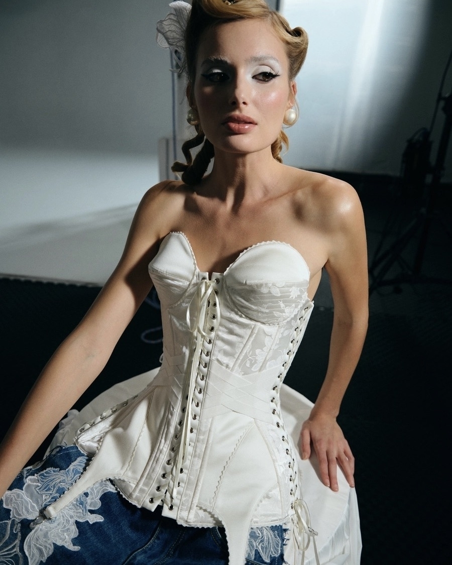 Корсет Daniil Antsiferov; джинсы Ushatava