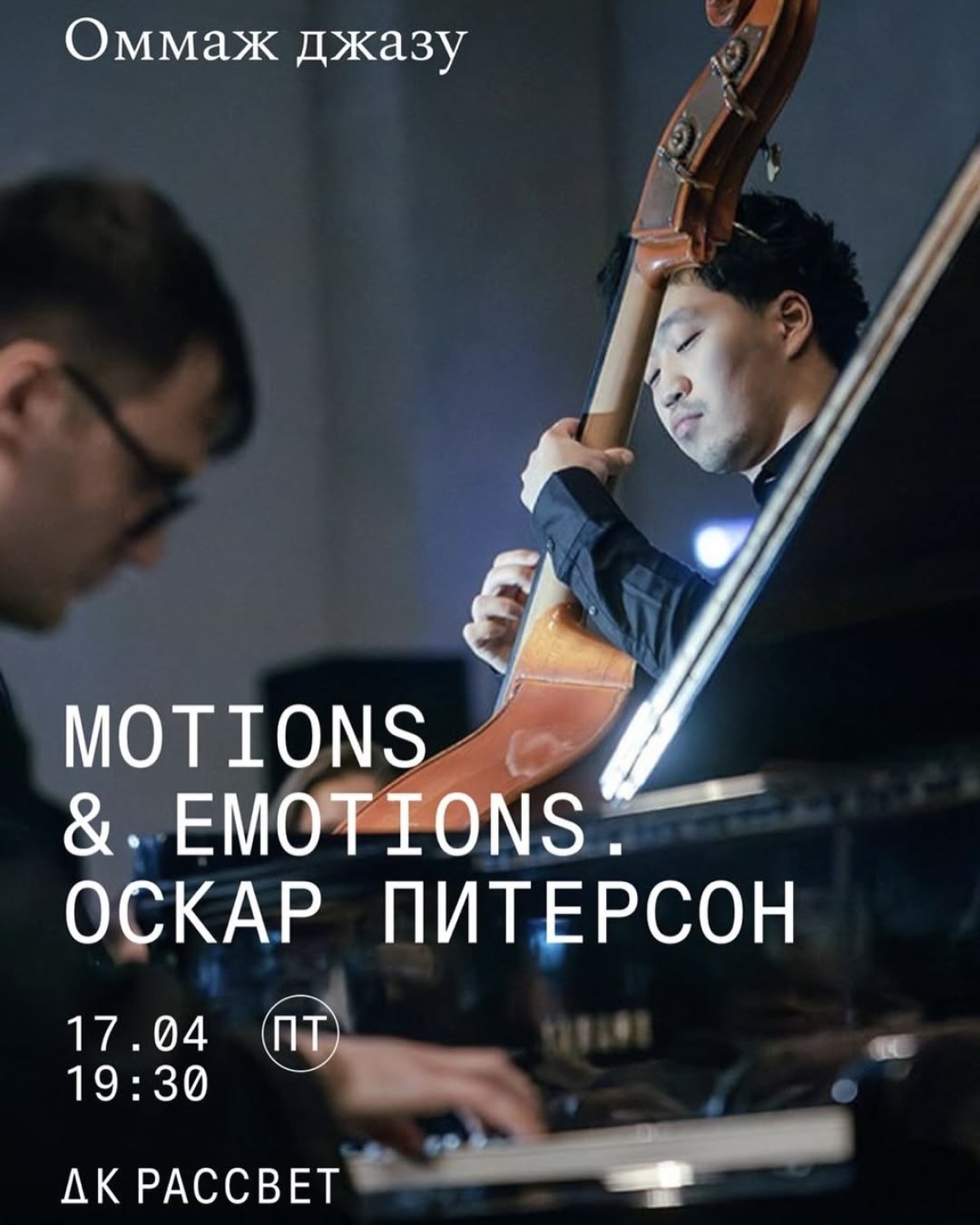 За вдохновением отправимся в Дом культуры «Рассвет», где пройдет концерт, посвященный легенде джазового мира — Оскару Питерсону. Motions & emotions будет состоять из избранных стандартов музыканта, которые исполнят пианист Элси Варандо, контрабасист Вадим Ким и барабанщик Сергей Стефко. Начало в 19:30, билеты от 1600 рублей.