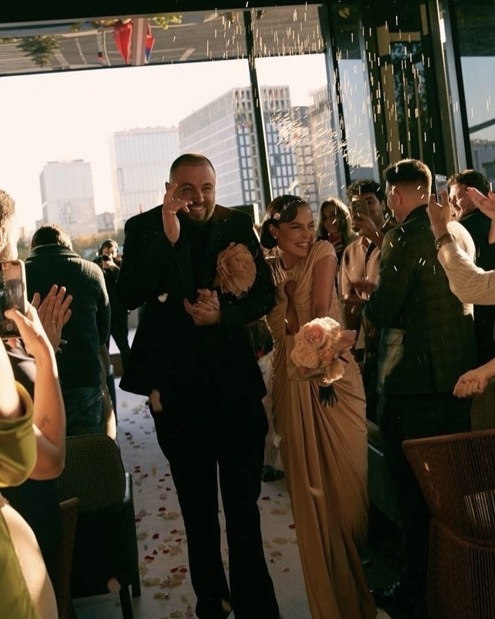 Солистка группы Artik & Asti, певица Севиль вышла замуж за музыканта Toni. Об этом поклонники узнали из социальных сетей — пара опубликовала несколько кадров с церемонии. В выборе образа невеста остановилась на кремовом платье Schiaparelli с фирменным вырезом в форме замочной скважины. Его она дополнила вуалеткой и букетом из пионовидных роз, который перекликался с большой брошью-цветком жениха.