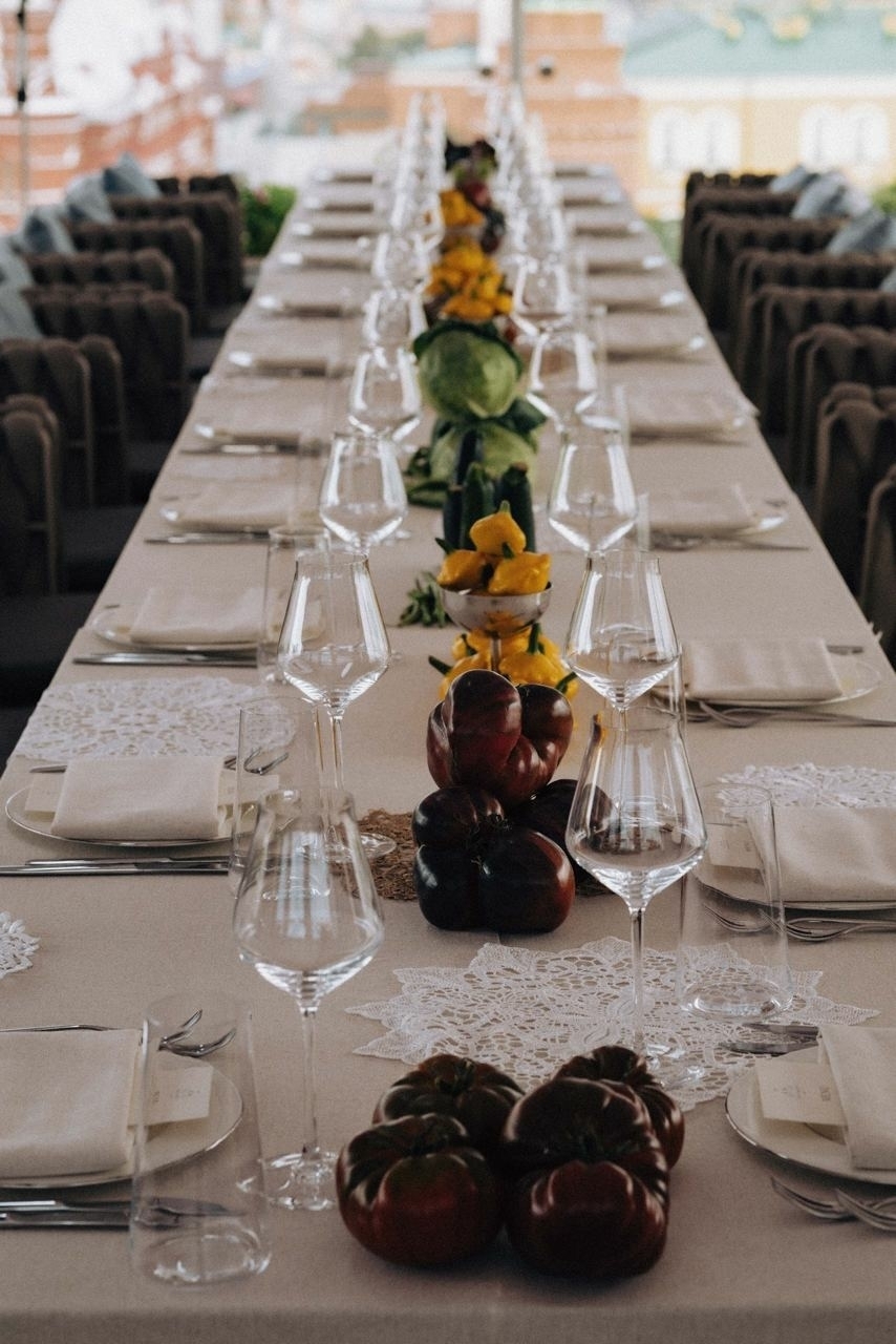 Теплый антураж вечеру создали декораторы PAVLÍNA design: на террасе с видом на город появились подсолнухи, овощи и скатерти с салфетками, будто из семейного сундука. Атмосфера получилась камерной и почти домашней — именно такой, чтобы вспомнить, как все начиналось.