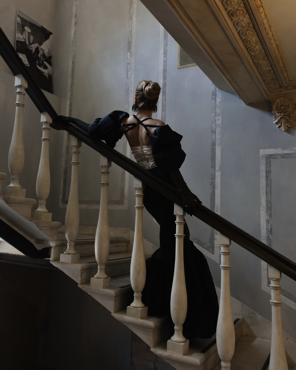 Образ для утренней съемки был собран в последний момент. Натали не хотела классической будуарной истории и склонялась к чему-то более нарядному. Так, выбор пал на черную юбку Munique из черной тафты, к которой на заказ сшили топ в молочном оттенке. А чтобы образ не выглядел простым, невеста обыграла его акцентными перчатками Say No More и серьгами Alaïa.