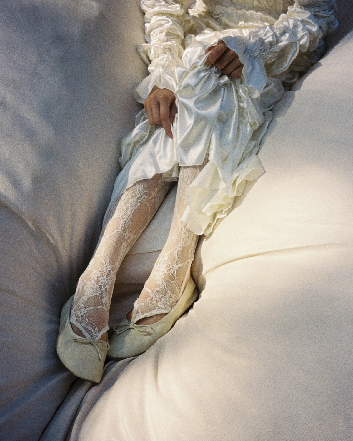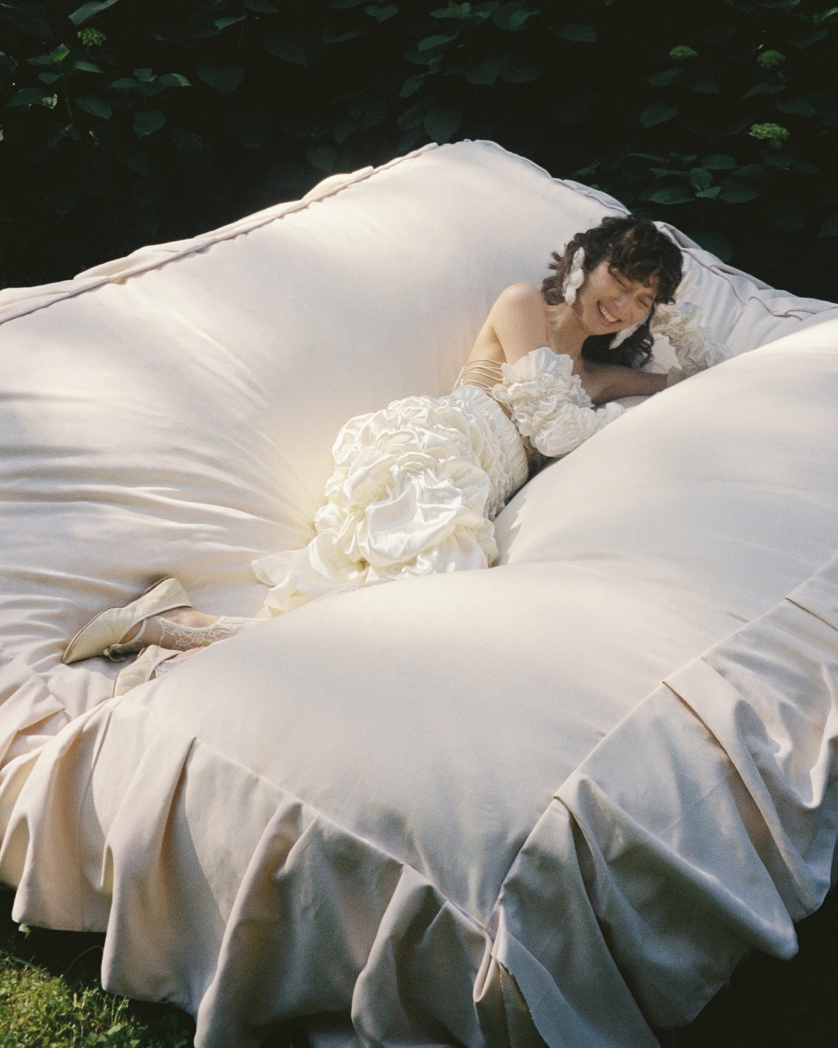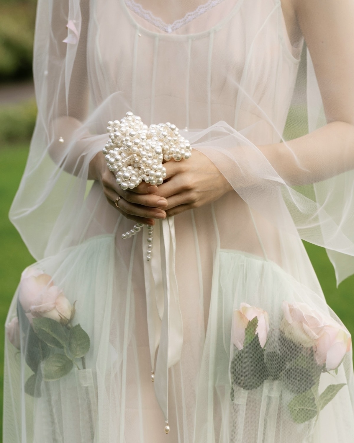 Идеальным вариантом для основного образа было полупрозрачное платье с цветочным декором от Simone Rocha. Но коллекция была уже давно распродана, и найти в наличии модель в нужном размере — та еще задачка. Случайная отметка бренда у небольшого ирландского магазина спасла ситуацию, и платье благополучно нашло свою хозяйку. Примечательно, что образ был не традиционный белый, а пастельно-зеленый.