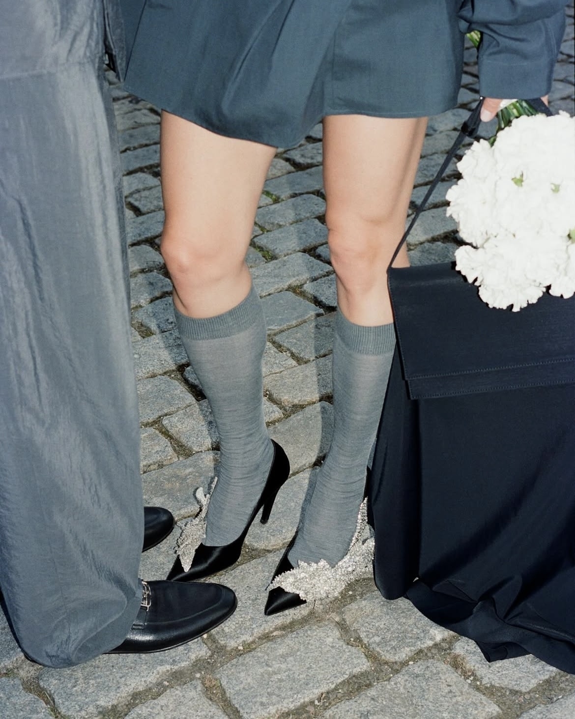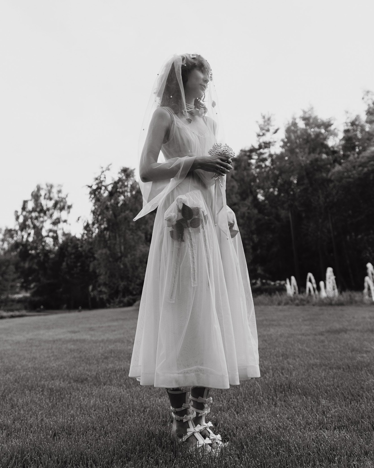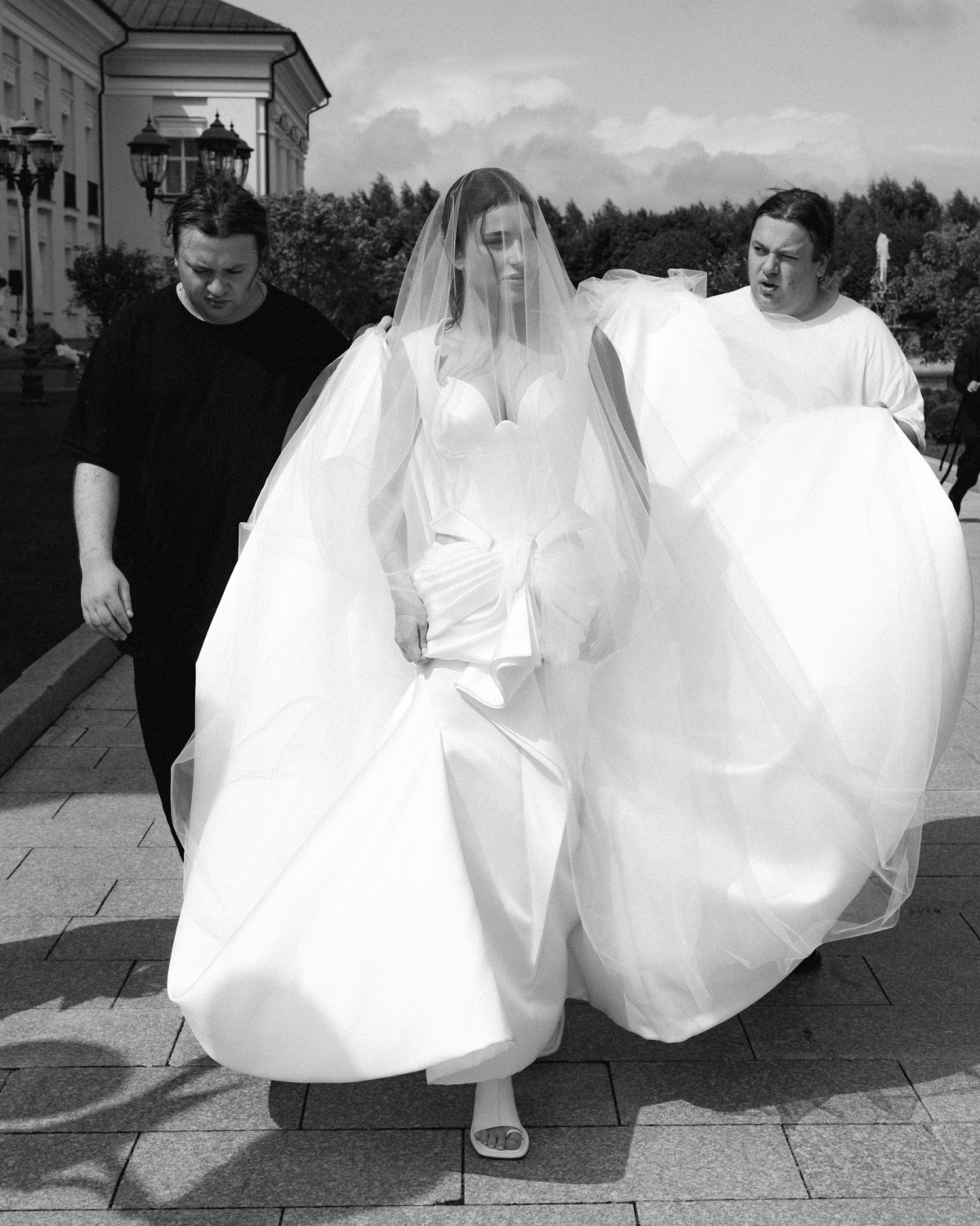 Так как свадьба занимала целых три дня, можно представить, какую работу над стилем невесты проделала София Бурнашева. Для росписи в усадьбе Мухиных идеально подошло платье австралийского дизайнера Каролин Резник, которое шили специально для Дарьи, но доехать оно не успело. Поэтому самым гениальным решением Софии было застилизовать уже купленные для образа архивные туфли Balenciaga вместе с серой рубашкой из гардероба жениха, гольфами в тон, черной сумкой-мантией Abra и максимально свадебным букетом от Антона Шуранова («Собран в саду»).