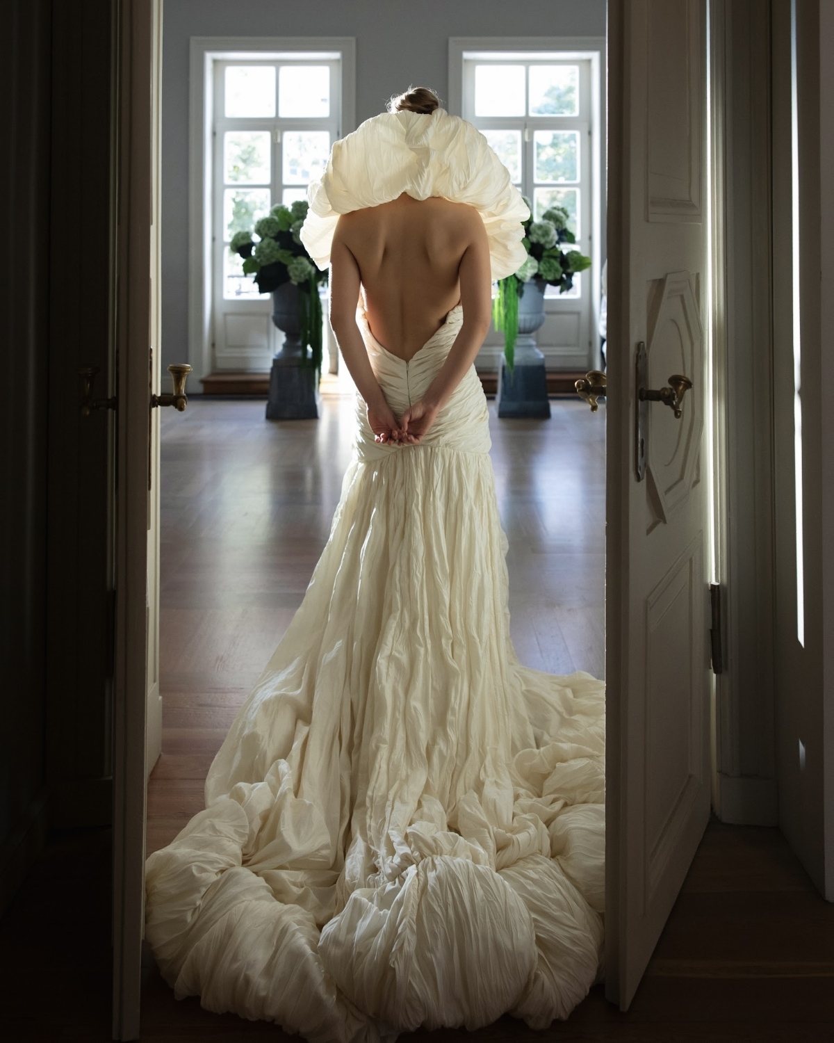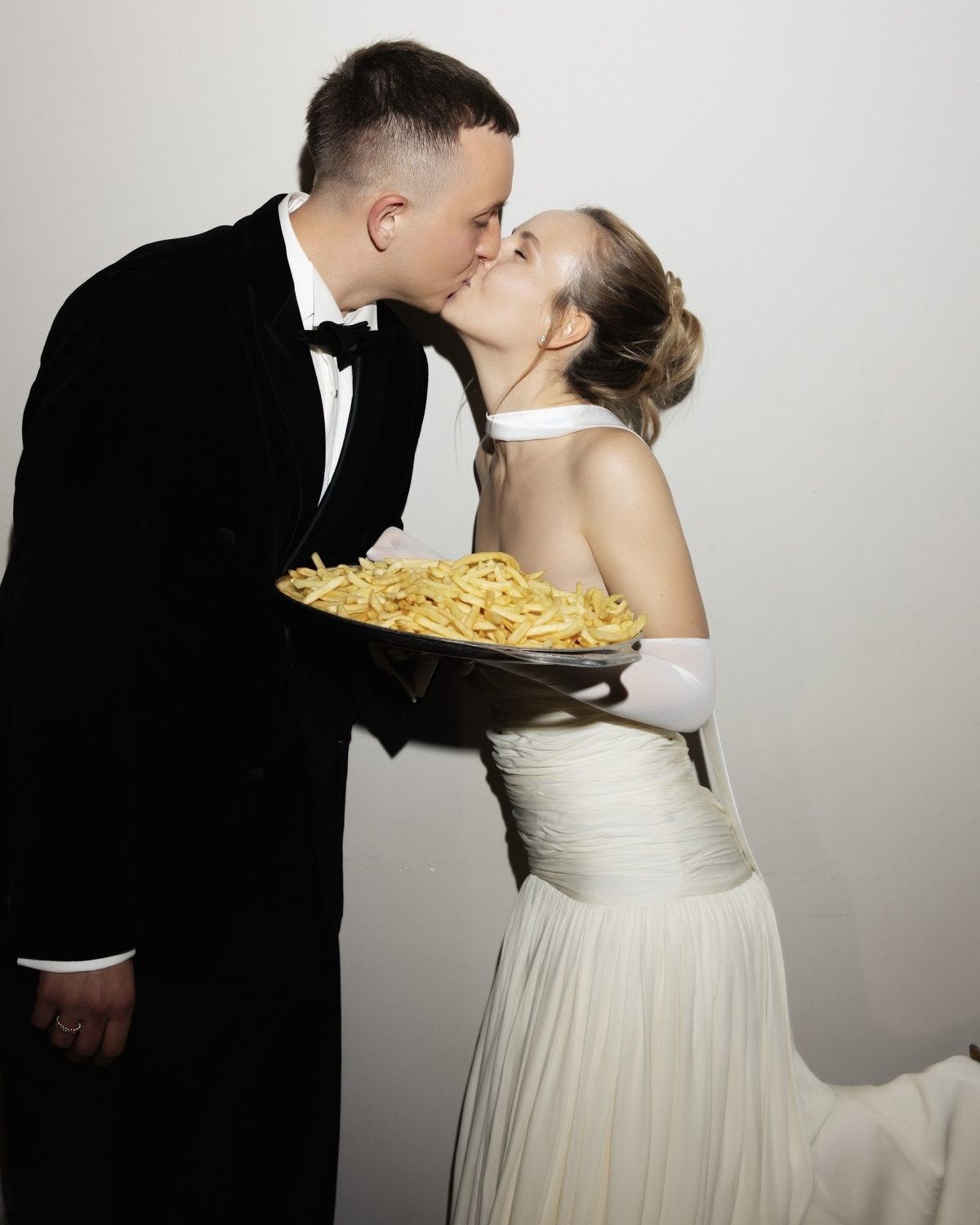 Второй день стал самым богатым на образы невесты. Сначала были ажурное платье из мятой ткани, напоминающее скатерть или штору, от бренда Lou de Bètoly вместе с похожей по текстуре и узору фатой. Правда, в этом образе невеста лишь поснималась. Платье оказалось слишком откровенным для вечеринки. Поэтому для еще одного обмена кольцами перед гостями Даша переоделась в чуть более закрытый, но не менее концептуальный образ, вдохновленный белыми мужскими рубашками из ее собственного гардероба.