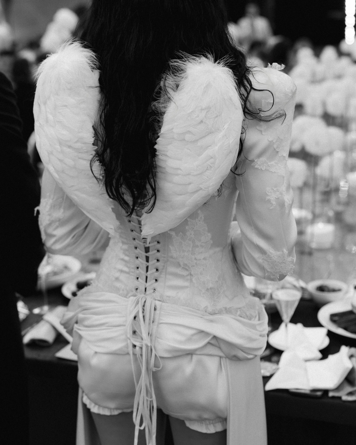 Для церемонии стилисты одели невесту в корсетный топ с вырезом-сердечком на спине и драпированную юбку в пол от бренда Belik. Обыграли образ минималистичной фатой с надписью в готическом стиле. Продолжением средневековой истории стал второй свадебный костюм невесты — из приталенного жакета со шнуровкой и настоящих ангельских крыльев и микрошорт в будуарном стиле авторства дизайнера Ильи Мигмуна.