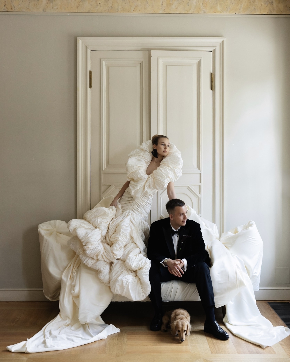 Для основного образа выбор почти сразу пал на платье с объемным воротником от Murashka, но в процессе пошива цвет решили изменить на кремовый. Это платье стало первой покупкой невесты — вокруг него начали строить всю концепцию. Образ дополнила моно-серьга в форме антуриума контрастного черного цвета из Poison Drop. Темную акцентную линию поддержали лаковые мюли Giuseppe Zanotti, которые идеально сочетались с обувью жениха.