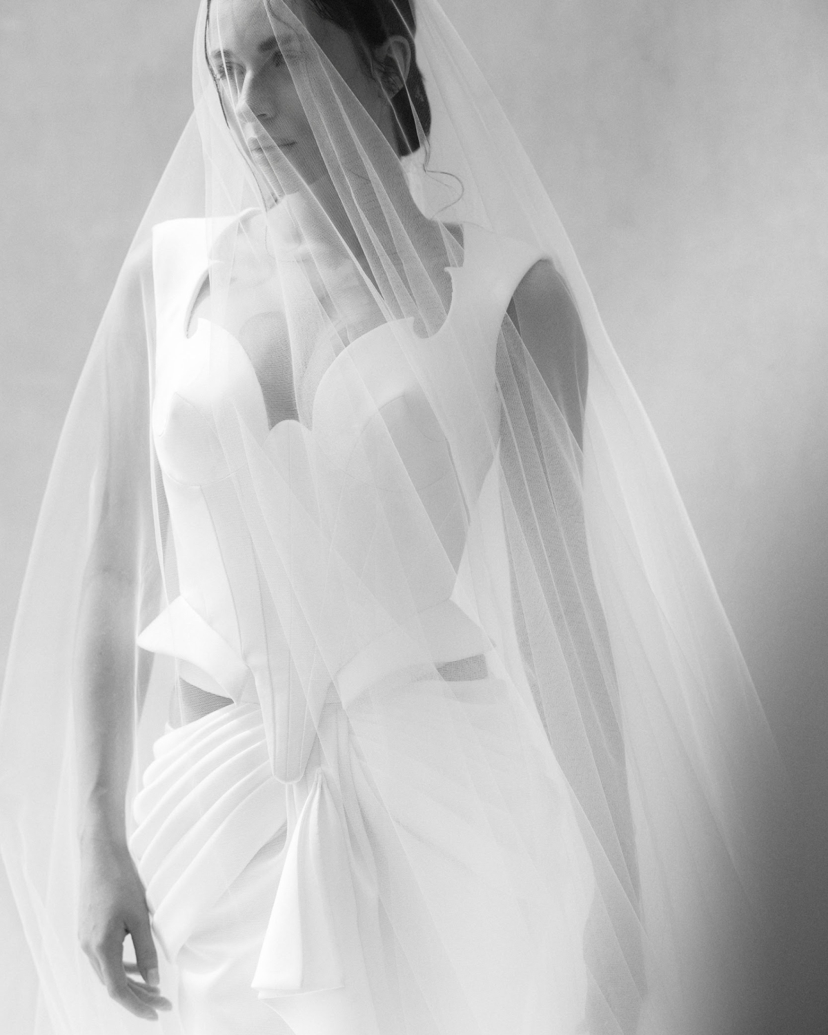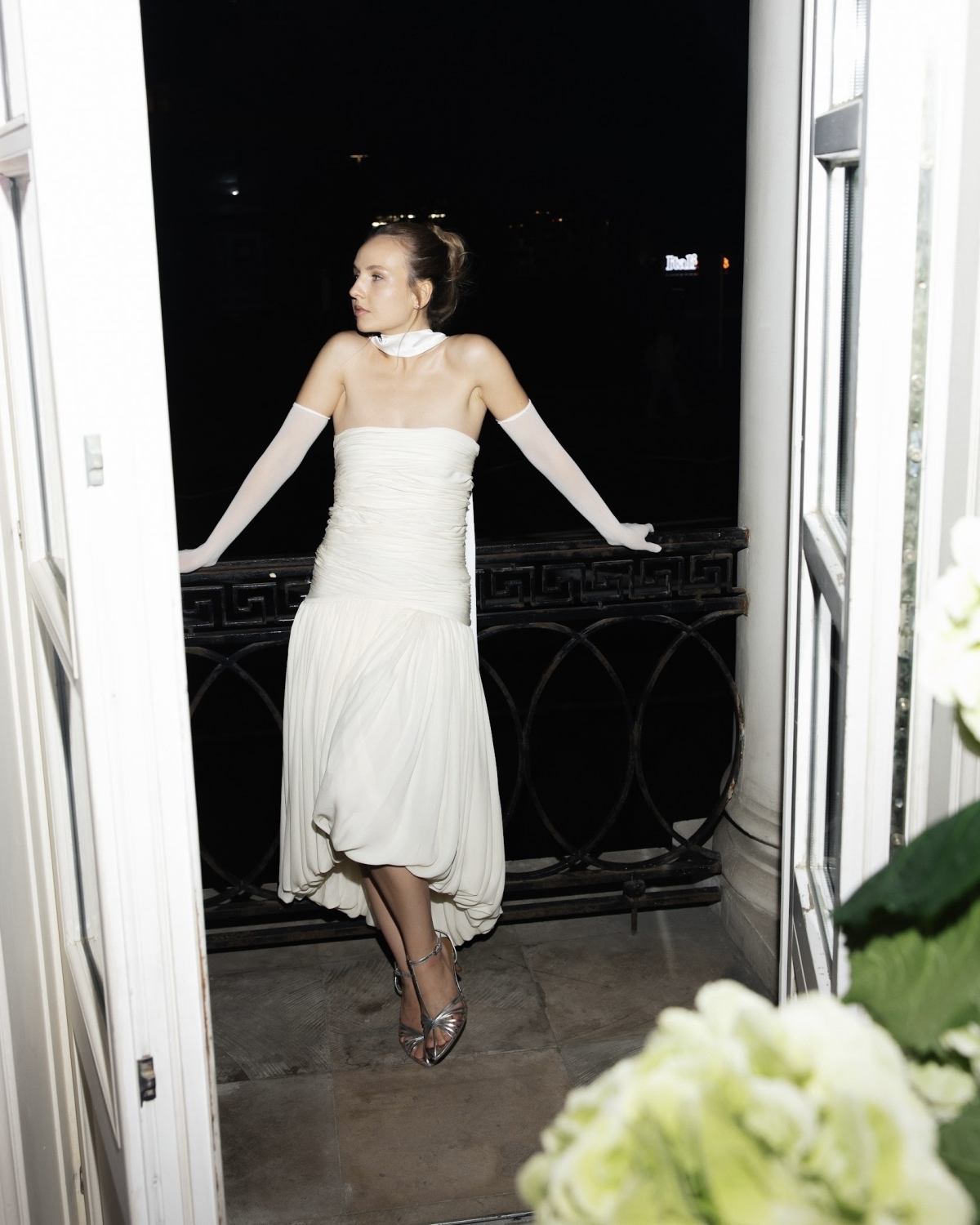 Вторым платьем невесты стала модель с низкой талией и обильной драпировкой от Khaite. Натали дополнила его сетчатыми перчатками в тон, длинным тонким шарфиком из шелка и бриллиантовыми пуссетами-гвоздиками, которые перекликались с серебристыми босоножками 12Storeez.