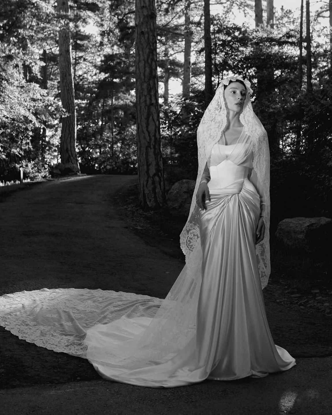 Свадебный образ главной вайнерши интернета в прошлом стал олицетворением новой главы в карьере (и жизни, конечно). Провокационный стиль сменился эстетикой тихой роскоши, и голому наряду невеста предпочла более сдержанный вариант. По неподтвержденным источникам (так пишет в своем телеграм-канале Ксения Собчак), в качестве основного образа — корсетное платье российского модельера Ulyana Sergeenko с драпированной юбкой и полупрозрачными деталями на топе. Но чтобы не уходить в тотальную классику и сделать образ более фактурным, стилист предложила добавить к атласному платью фату — не минималистичную из тюля или органзы, а кружевную. Детали на этом не закончились. Для еще более сложного образа к фате добавилась тиара ручной работы Atelier PM из серебра 925-й пробы с 1158 фианитами.