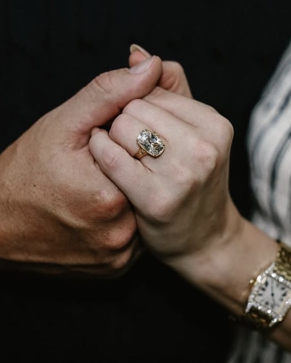 Для создания кольца Трэвис Келси обратился к ювелиру Киндред Любек — основательнице нью-йоркского бренда Artifex Fine Jewelry, известного вниманием к деталям и ручной гравировкой. В центре украшения — редкий бриллиант в огранке antique cushion с крупными гранями и мягким сиянием. Камень обрамлен тонким ободком-halo и боковыми акцентами, а внутренняя часть кольца украшена изящной гравировкой. Благодаря этому оно выглядит как винтажная реликвия, хотя создано специально для Тейлор.