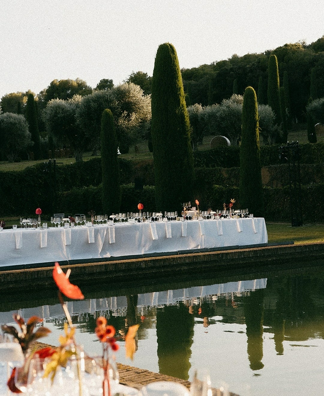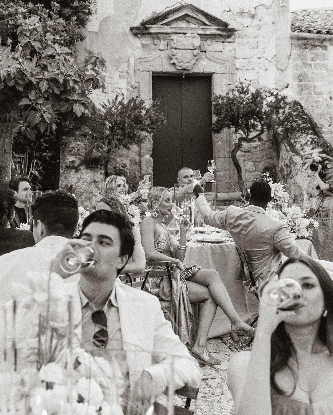 Один длинный общий стол — красиво, по-европейски, душевно. В таком формате легко устроить почти домашний по своей атмосфере ужин с разговорами, вином и смехом. Официантам удобно, а пара может ходить вдоль стола и со всеми общаться. Правда, надо быть готовыми к тому, что гости, скорее всего, будут вести разговоры только с теми, кто сидит рядом.