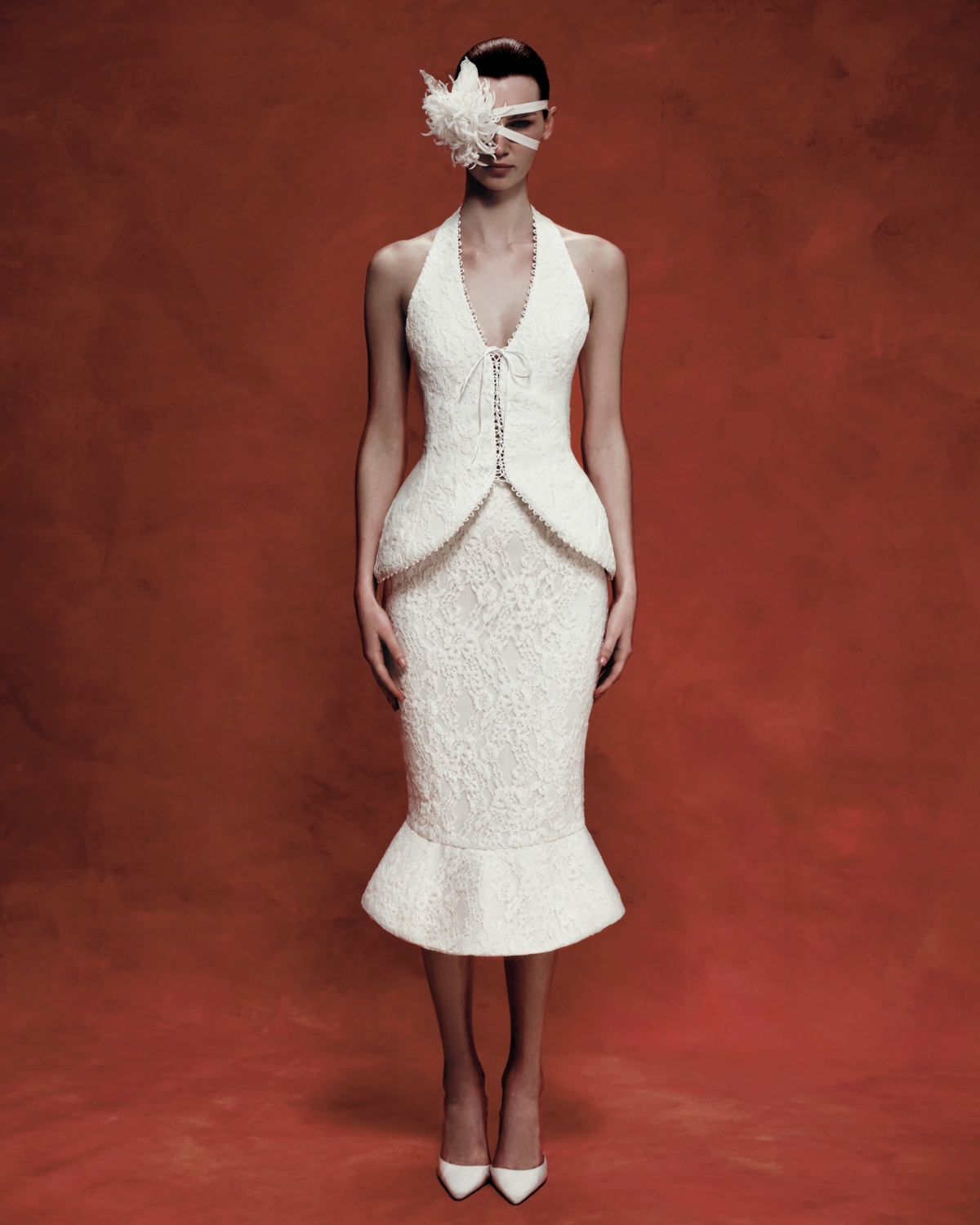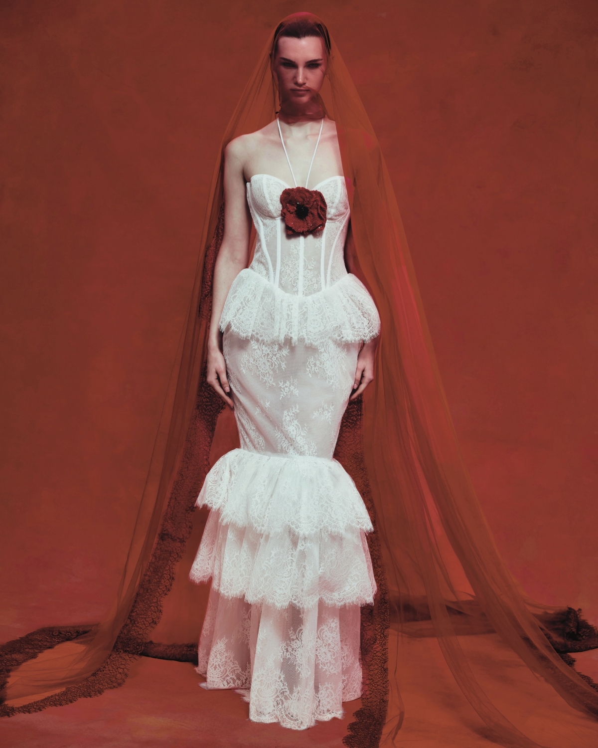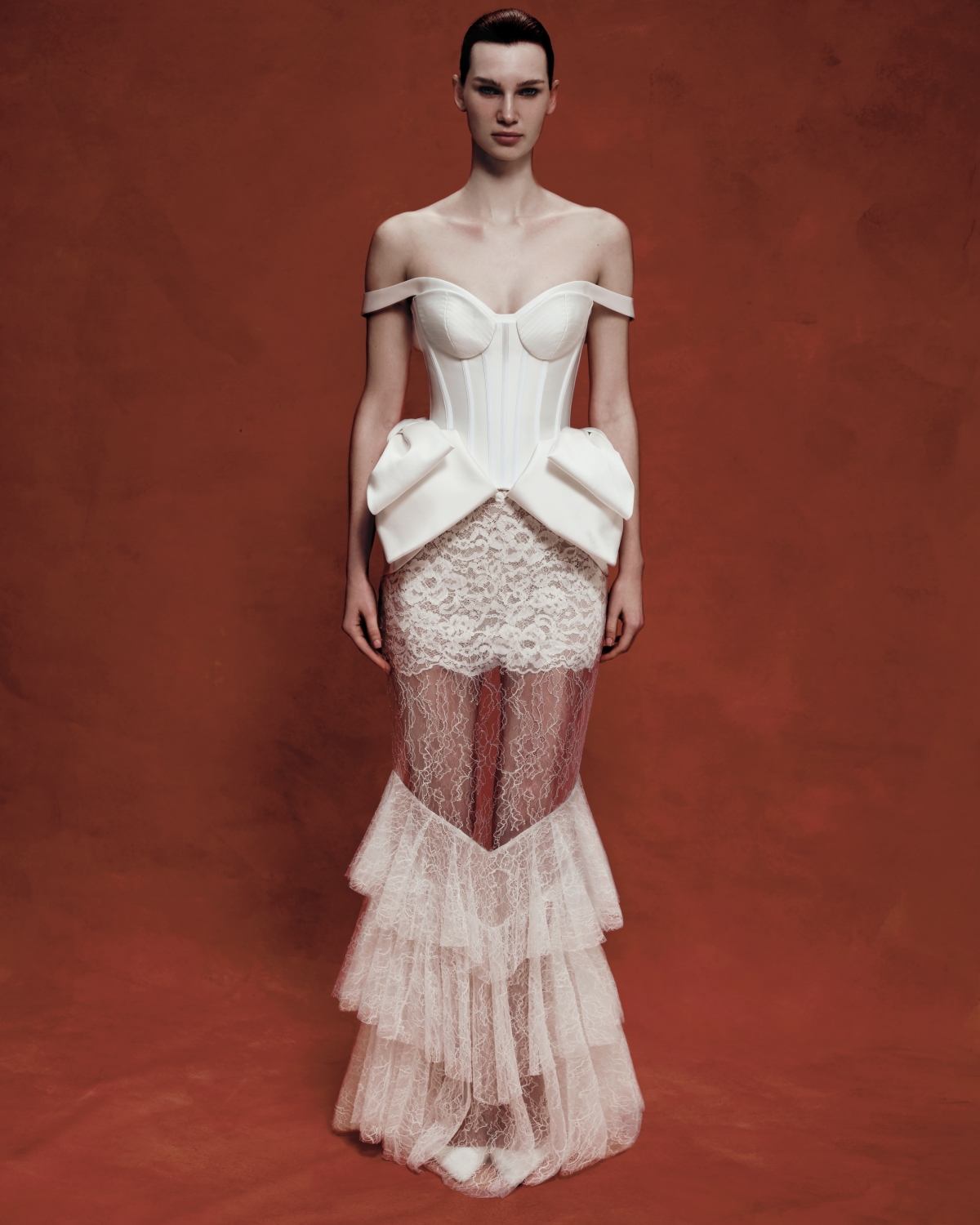 Мы активно работали с многослойным наложением разных видов кружева, создавая новые фактуры и глубину. Вторым важным элементом стала конструкция силуэтов: фижмы и каркасы, которые позволили придать платьям более скульптурную, почти архитектурную форму.