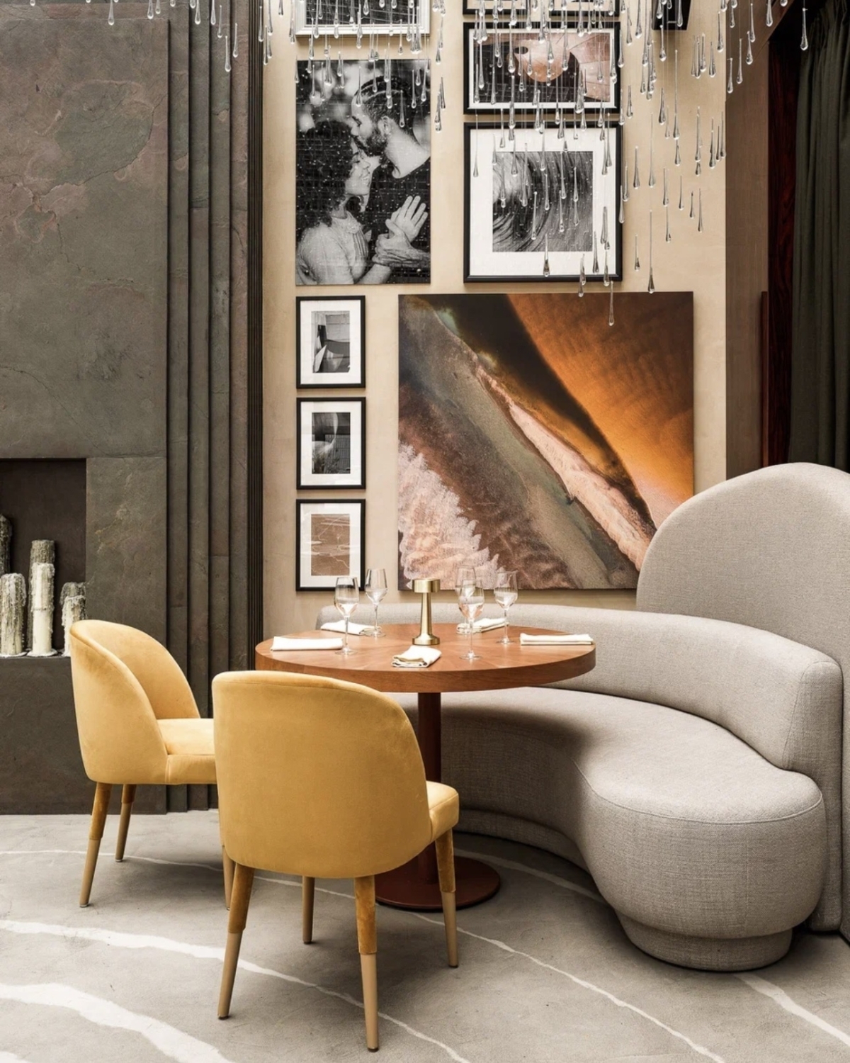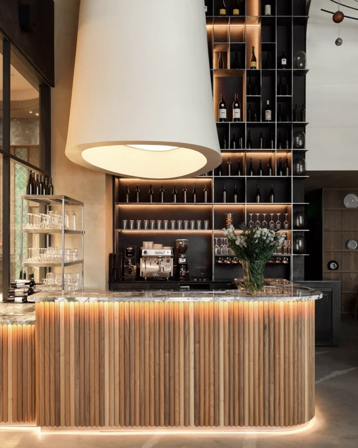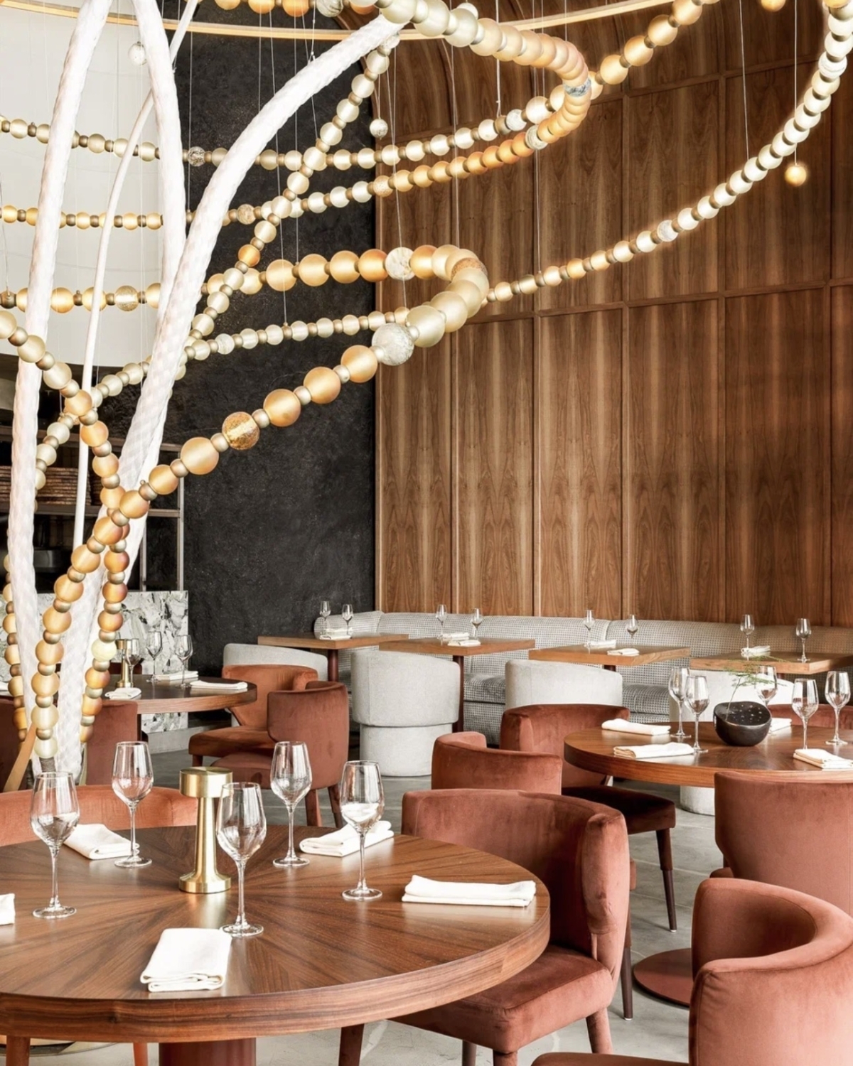 Здесь каждая деталь работает на ощущение уюта и особенного настроения: панорамное остекление с видом на город, дизайнерские конструкции, эффектные арт-объекты и световые акценты. Центральный элемент интерьера — девятиметровый «Эфириум» из золотых бус, пронизанных лучами света. Повсюду встречаются символы стихий: «земля» в натуральных материалах бара, «воздух» в стеклянных потолках, «огонь» в восьмиметровой пицца-печи и «вода» в каскаде из 5888 хрустальных капель.