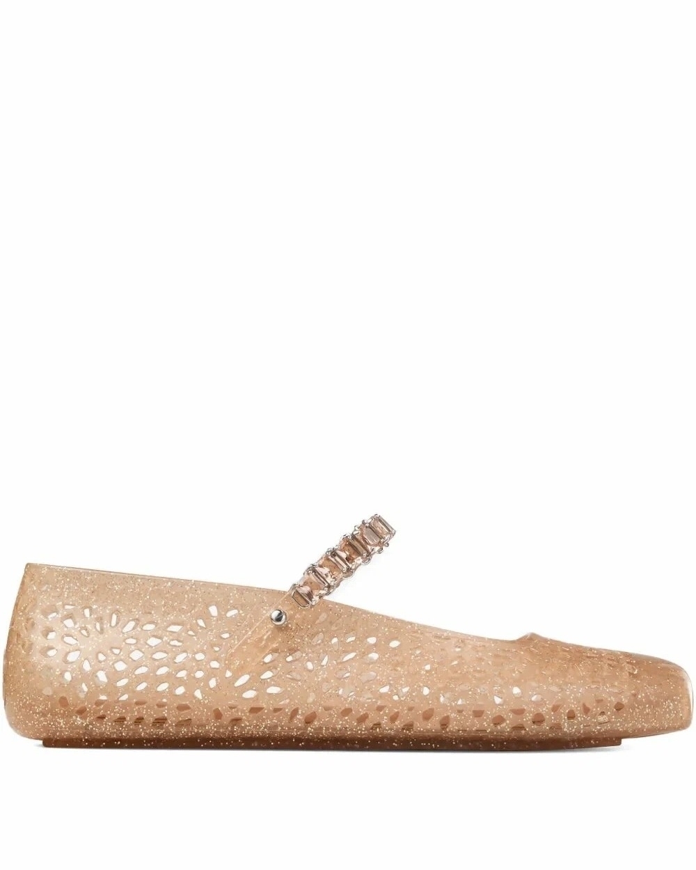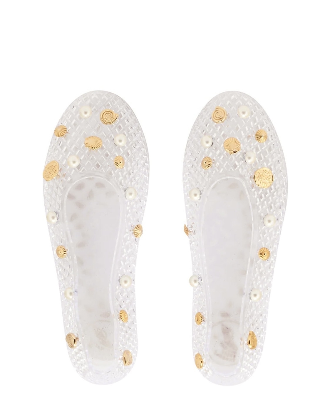 Если открытая обувь на каблуке — не ваш вариант, а сапоги кажутся слишком повседневной историей, присмотритесь к балеткам. Как правило, выглядят модели из резины не менее эффектно, чем похожие варианты из других материалов. Особенно если есть акцентные детали в виде бантов, бусин и цветов.