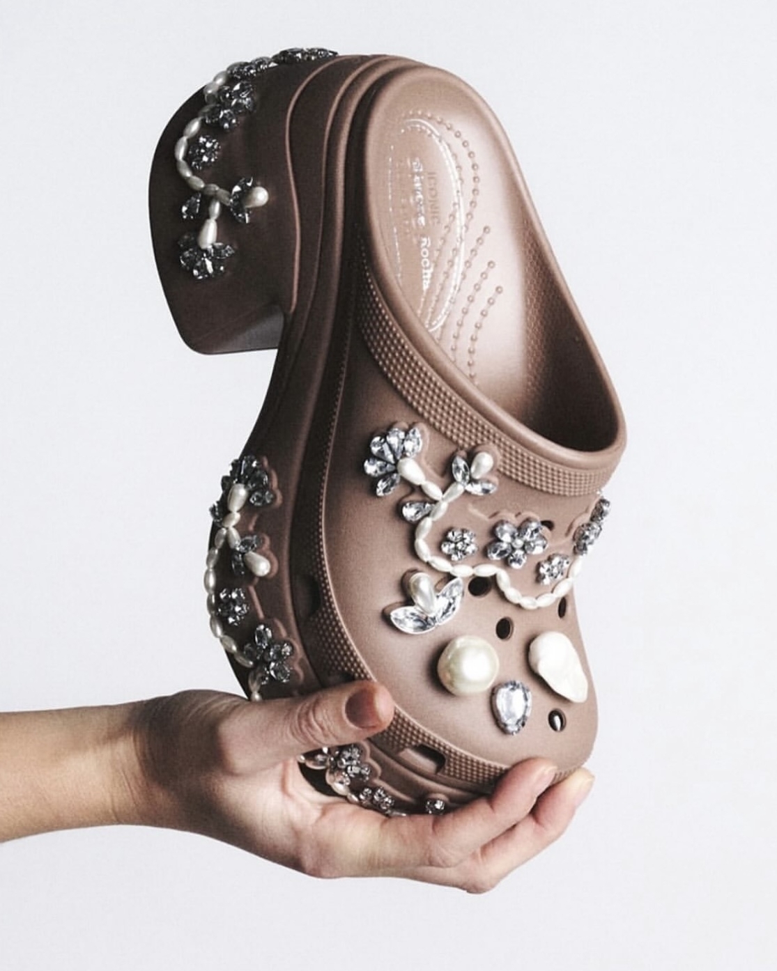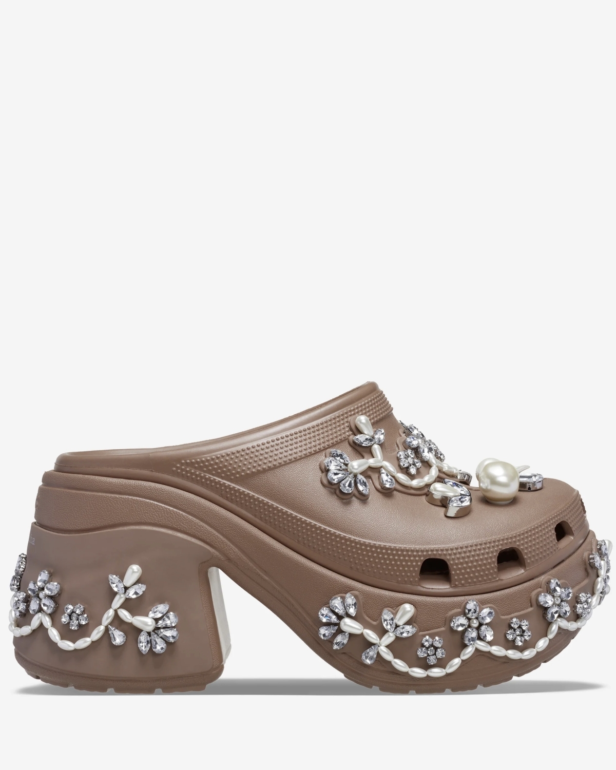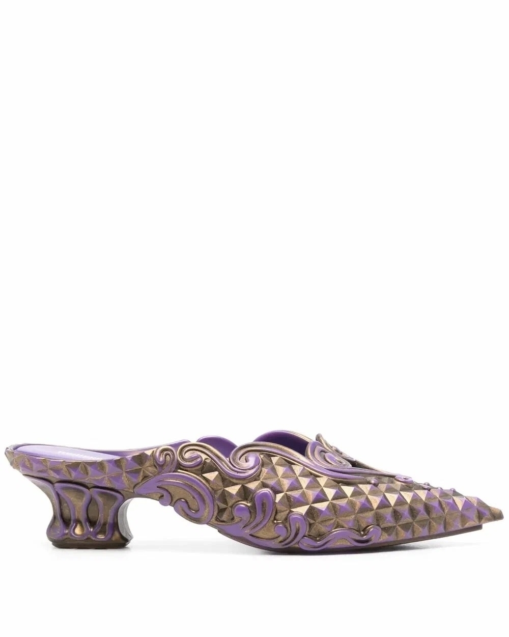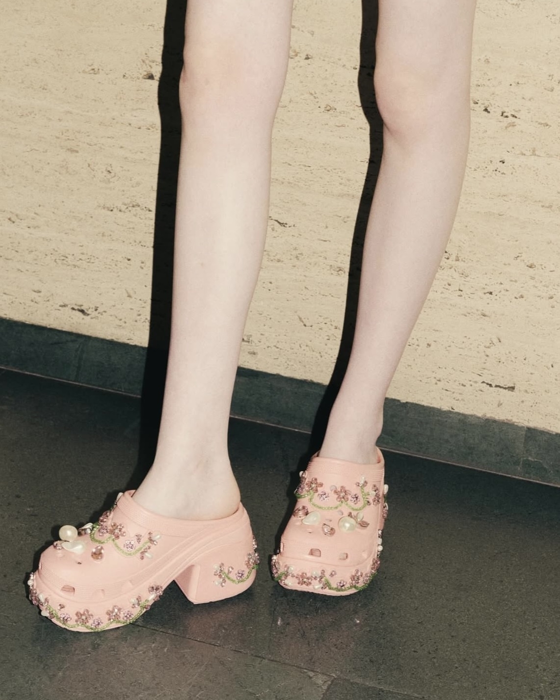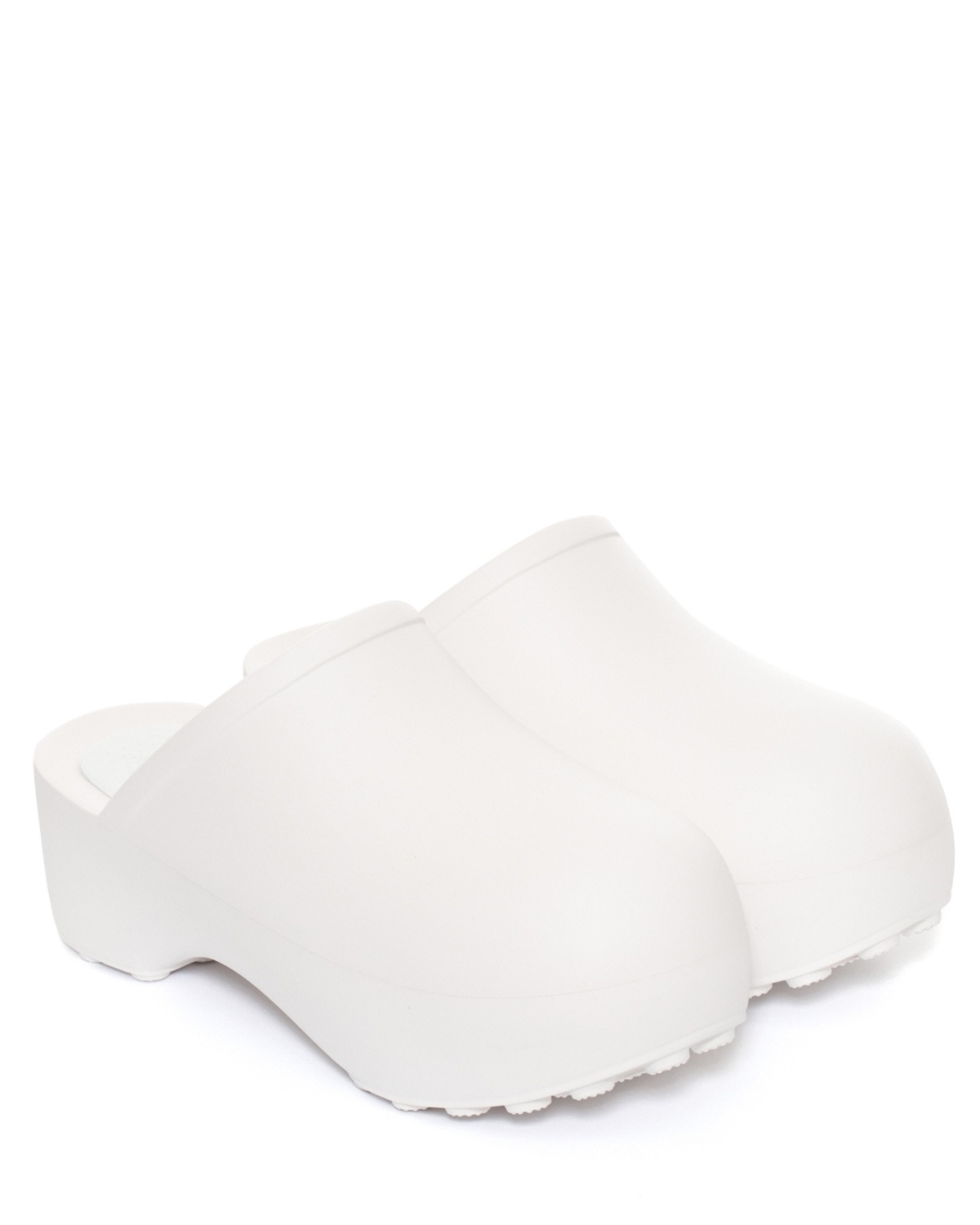 Остроносые мюли подойдут практически под любое свадебное платье. И кажется, то, что они сделаны из резины, — скорее плюс, чем минус. Можно не переживать, что обувь испортится от воды и грязи, как светлый атлас или замша. Присмотреться также советуем к трендовым в этом сезоне клогам на небольшом каблуке или платформе, которые помогут сбалансировать слишком романтичное платье.