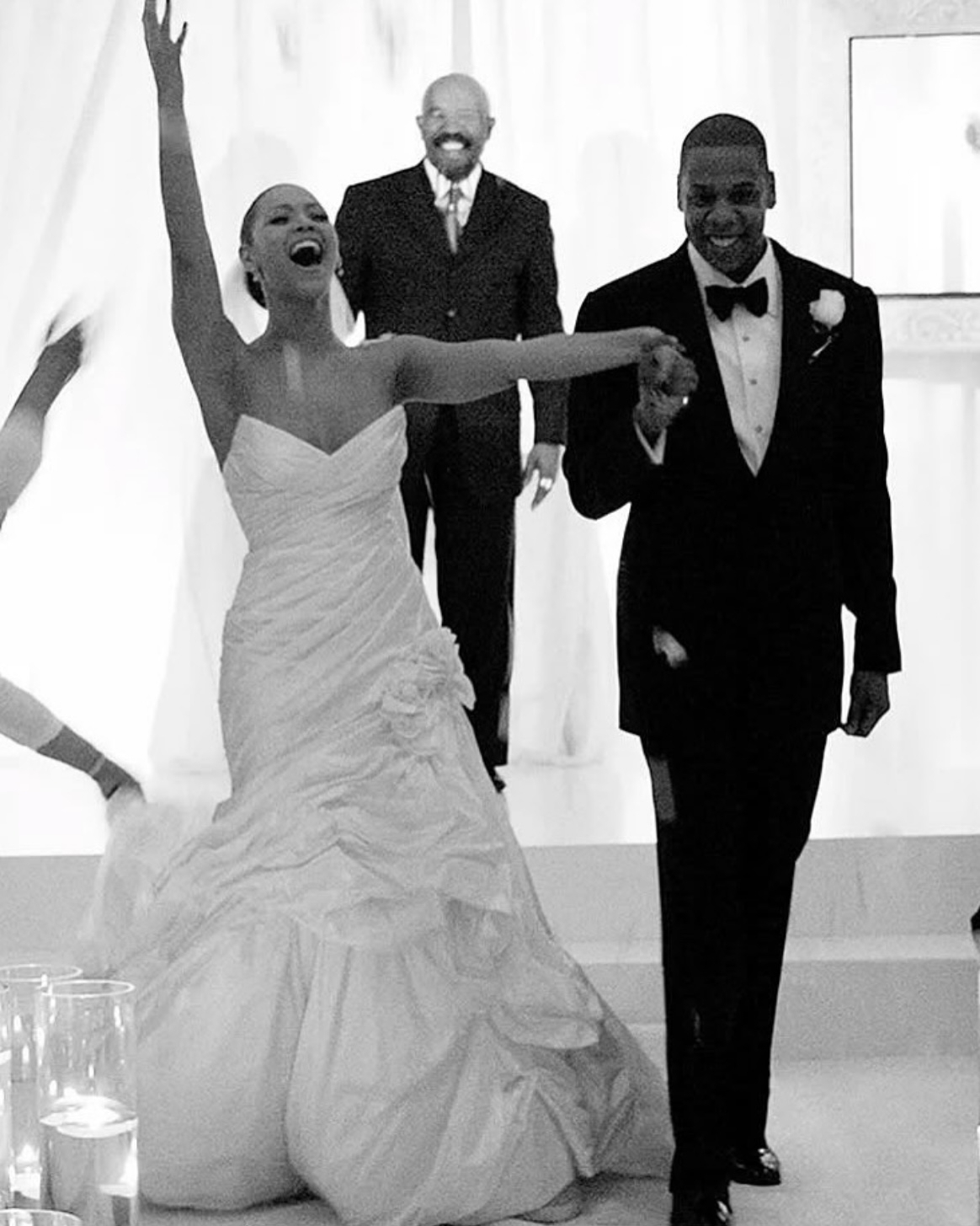 Как выяснилось позже, свадебное платье Бейонсе авторства дизайнера Риккардо Тиши было создано для Givenchy и отражало стиль артистки гораздо точнее, чем все другие варианты. Приталенный силуэт подчеркнул фигуру невесты, а длинный шлейф и объемный декор на юбке добавили образу немного драмы. По данным источников, наряд обошелся артистке примерно в $500 тысяч.