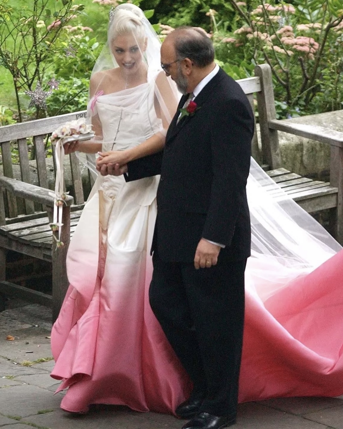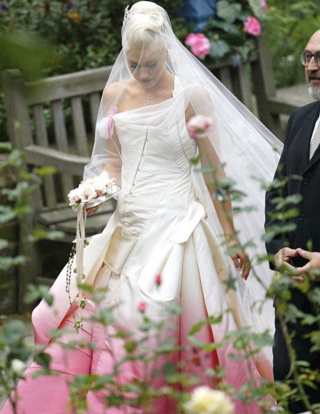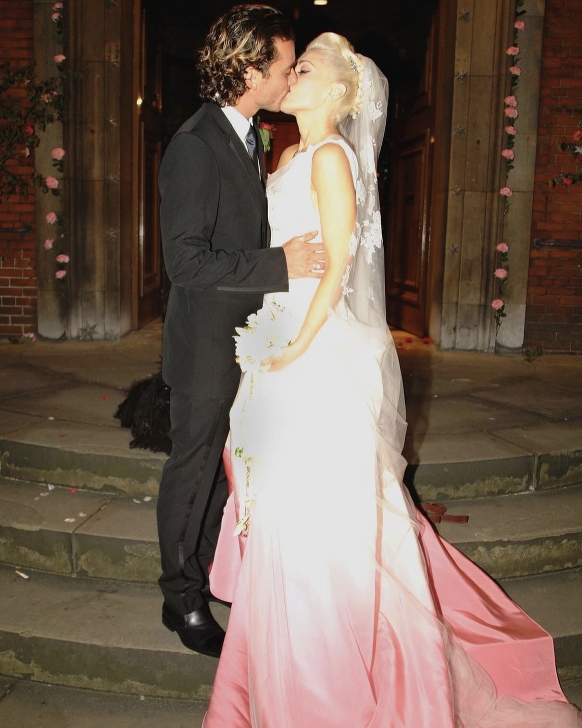Певица не стала изменять своему традиционному эпатажному стилю и под венец надела неклассическое для свадьбы платье, разработанное Джоном Гальяно для Dior. Корсет, фактурный белый шелк и ярко-розовый градиент на подоле юбки идеально раскрывали характер певицы. К слову, дизайнерское платье обошлось рок-звезде в нескромные $300 тысяч. Но оно того точно стоило.