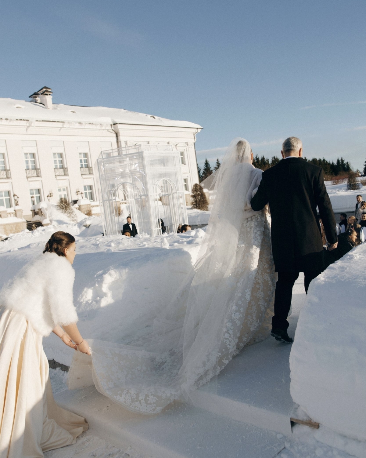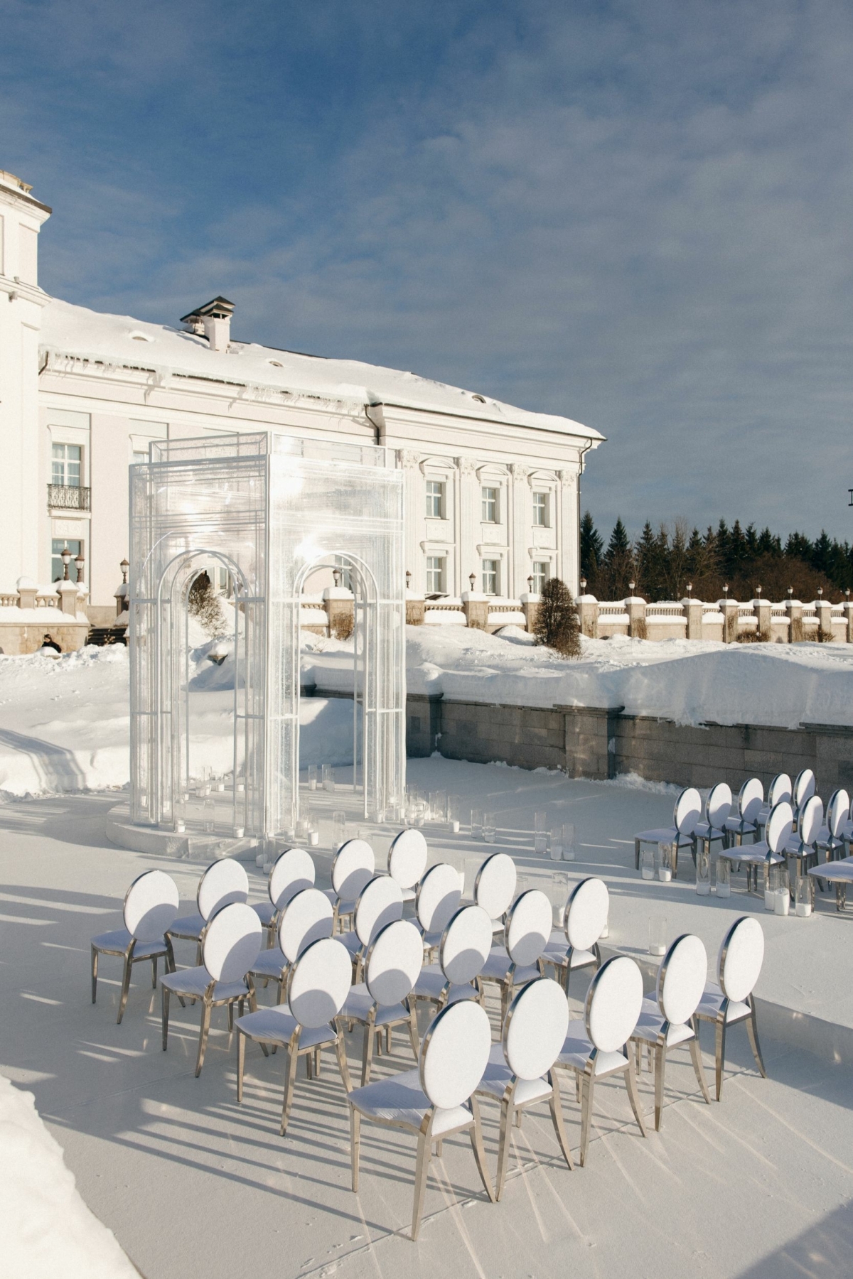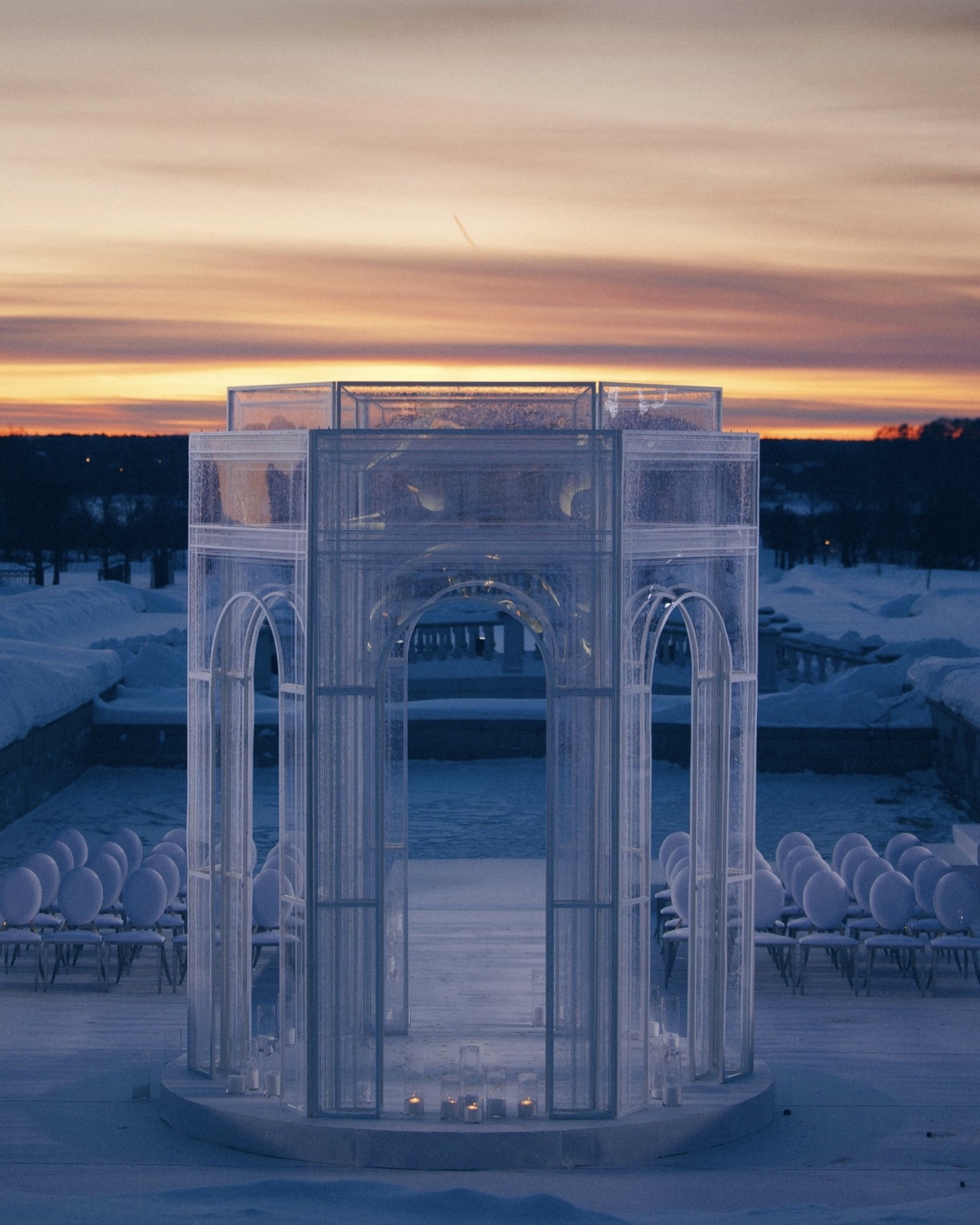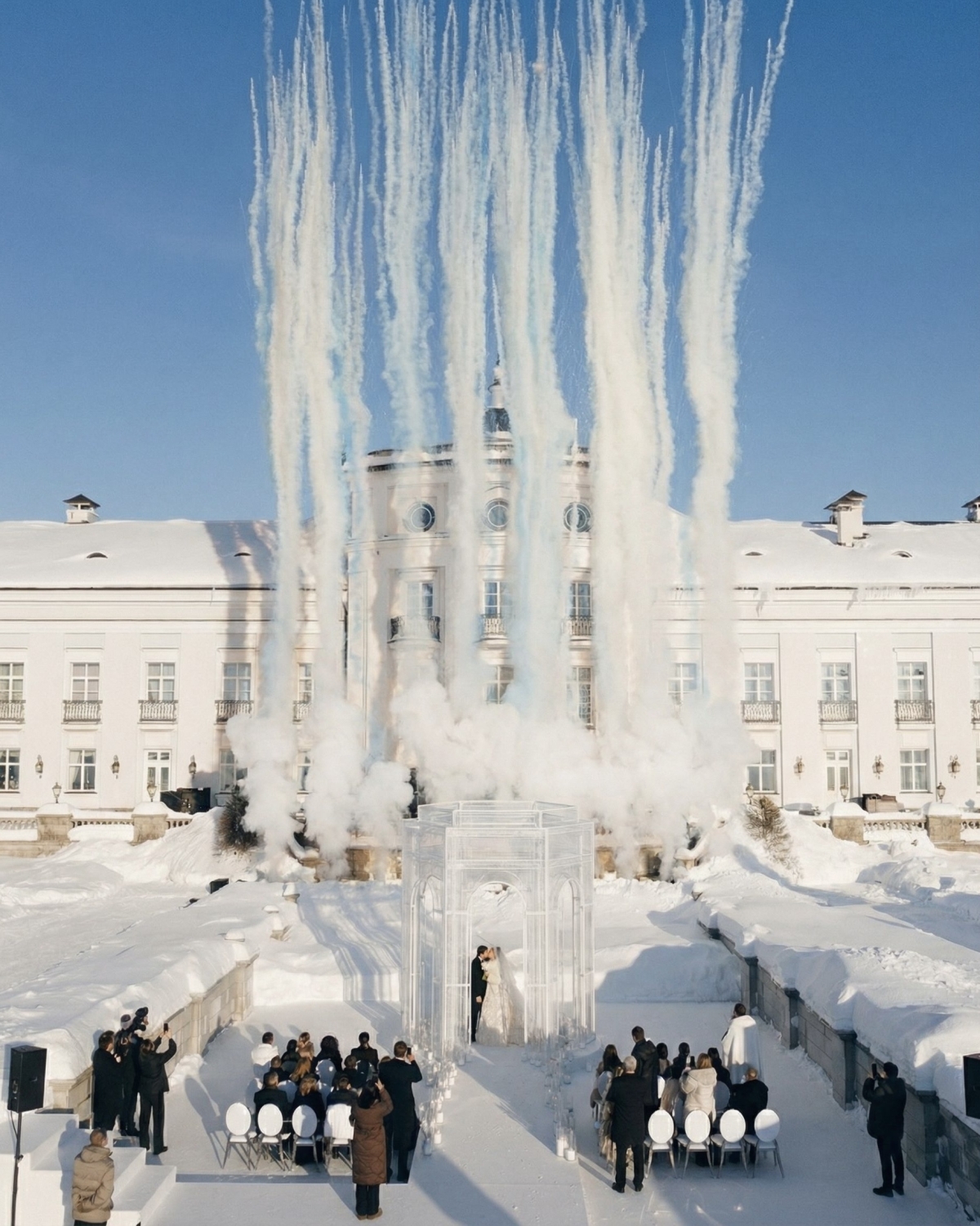 Затем гости выходили на церемонию, где появлялась совершенно другая среда. Архитектурная композиция, напоминающая ледяной замок, строилась на прозрачности, графике и холодном свете, усиливая ощущение зимней сказки. Именно здесь проект получил дополнительный спецэффект, который невозможно было запланировать. Буквально за час до церемонии стих ветер, прекратился снегопад и вышло солнце. Свет стал частью сценографии, подчеркнул формы, заставил снег засиять и придал всему происходящему почти кинематографическую выразительность.