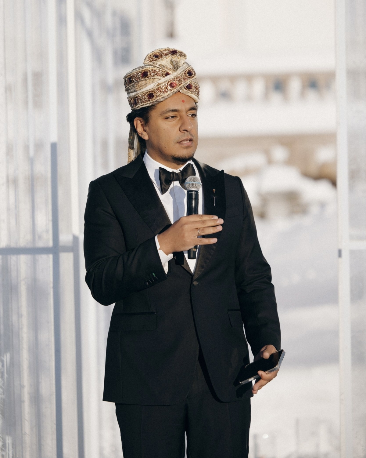 Один из самых запоминающихся ходов возник уже в процессе разработки сценария. Ведущий Адис Маммо был выбран еще до появления концепции, и позже стало понятно, что его образ отлично ложится в эту историю — в какой-то момент он даже напоминал персонажа, связанного с Индией. Это неожиданно совпало с историей пары и рейсом из Дели, на котором они познакомились. В церемонии это обыграли через сцену, где он от лица пассажира рассказывал историю их знакомства. Прием выглядел органично и точно попадал в контекст вечера, усиливая ощущение личной истории.